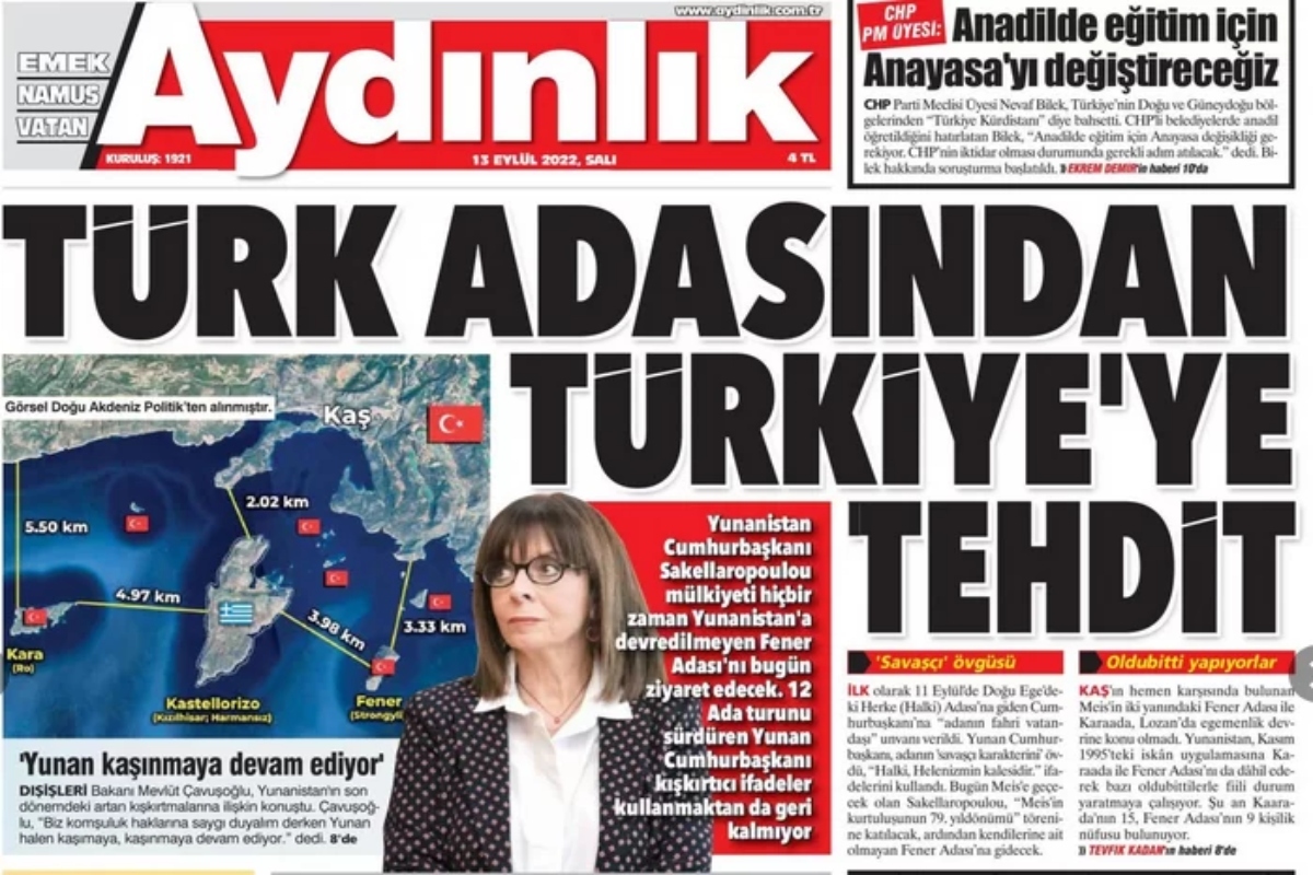 «Απειλή προς την Τουρκία από τουρκικό νησί» είναι ο τίτλος της εφημερίδας (φωτογραφία, επάνω), η οποία αναφέρει ότι η Πρόεδρος της Δημοκρατίας της Ελλάδας Σακελλαροπούλου σήμερα (χθες) θα επισκεφτεί το νησί Στρογγυλή του οποίου η ιδιοκτησία ποτέ δεν παραδόθηκε στην Ελλάδα.