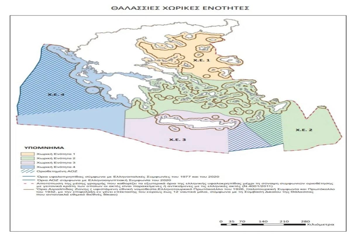 Οι ίδιες πηγές σημείωναν ότι οι θαλάσσιες περιοχές που αποτυπώνονται στον χάρτη, συμπεριλαμβάνουν τις ελληνοϊταλικές συμφωνίες οριοθέτησης ΑΟΖ του 1977 και του 2020 και την ελληνο-αιγυπτιακή συμφωνία του 2020, ενώ συμπίπτουν με τα όρια που απορρέουν από τον νόμο 4001/2011.