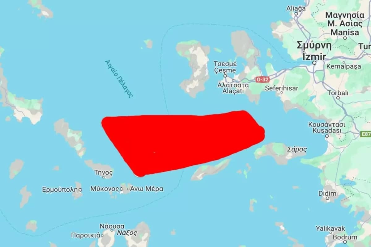 Ο χώρος που έχει δεσμεύσει η Τουρκία για τις ασκήσεις της είναι «προκλητικά» μεγάλος, ξεκινώντας από τα ανοιχτά της Σάμου και καταλήγοντας στα ανοιχτά των Κυκλάδων, την Άνδρο και την Τήνο, όπως φαίνεται παρακάτω στην φωτογραφία.