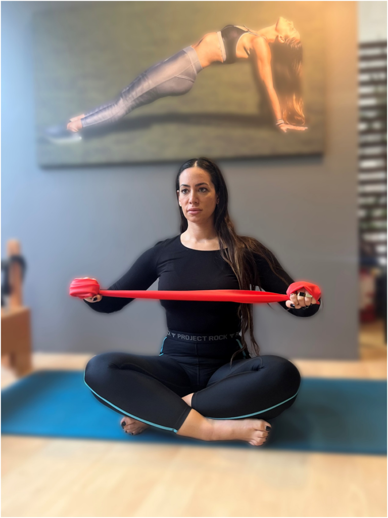 Κάθομαι σε εδραία θέση με ίσια πλάτη, κρατώντας το λάστιχο από τις άκρες με τα χέρια λυγισμένα μπροστά. Με την εκπνοή, τεντώνω τα χέρια στο πλάι, τραβώντας το λάστιχο και επαναφέρω στην αρχική θέση αργά και ελεγχόμενα, επαναλαμβάνοντας για 1′.
