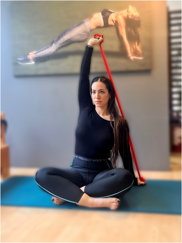 Παραμένω στην ίδια θέση με ίσια πλάτη, κρατώντας το λάστιχο από τις άκρες με τα χέρια λυγισμένα κάθετα μπροστά. Με την εκπνοή, τεντώνω το πάνω χέρι, τραβώντας το λάστιχο και επαναφέρω στην αρχική θέση αργά και ελεγχόμενα, επαναλαμβάνοντας για 1′ και για το άλλο χέρι.
