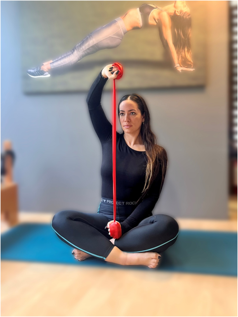 Κάθομαι σε εδραία θέση, με το ένα χέρι κρατάω το λάστιχο προς τα κάτω και τοποθετώ το άλλο χέρι λυγισμένο δίπλα στο κεφάλι, οριακά να ακουμπάει. Με την εκπνοή τεντώνω προς τα πάνω το χέρι μου, με την κίνηση να γίνεται από τον αγκώνα. Επαναλαμβάνω την άσκηση για 1′ σε κάθε χέρι.