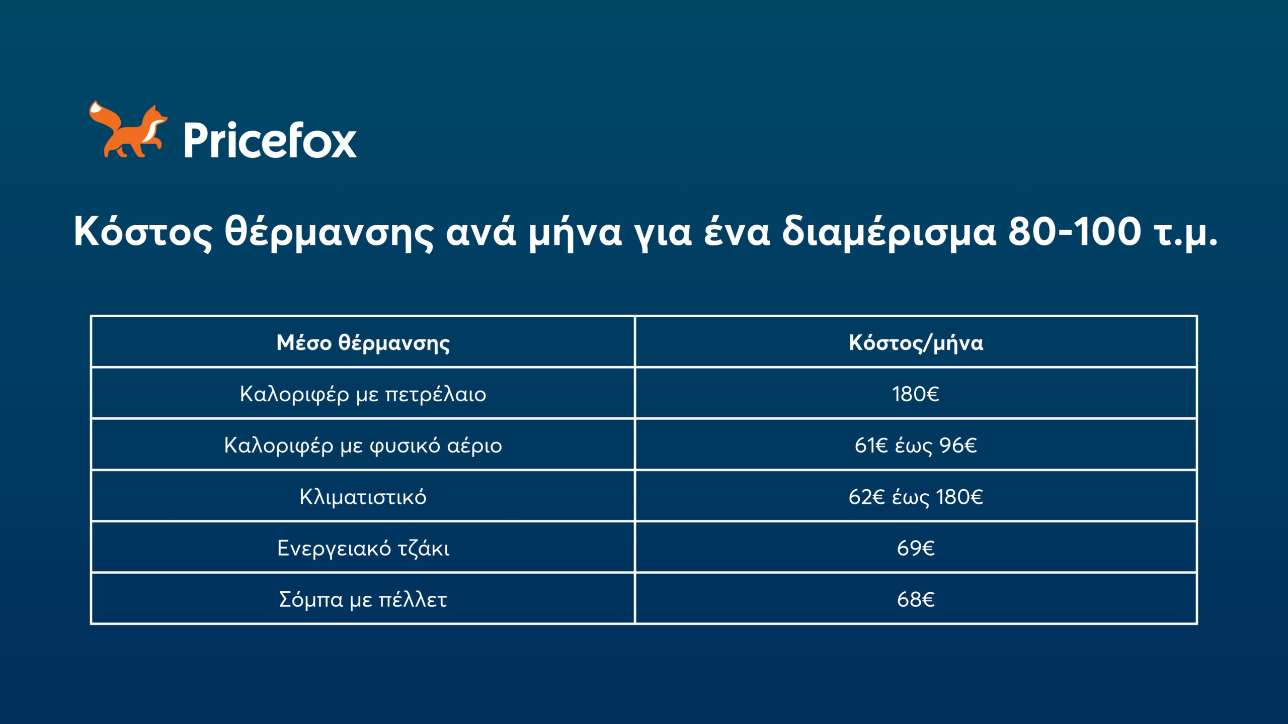 Το Pricefox, η κορυφαία πλατφόρμα σύγκρισης παρόχων ενέργειας, σύγκρινε το κόστος για τους διάφορους τρόπους θέρμανσης ενός διαμερίσματος 80-100 τ.μ. με σύστημα θέρμανσης που λειτουργεί για 8-10 ώρες την ημέρα για τα εξής καύσιμα: