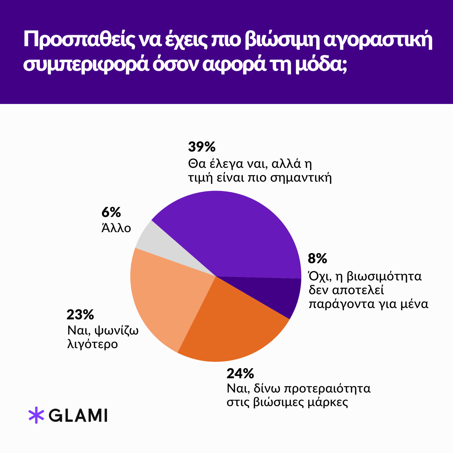 Μια μεγάλη μερίδα των ερωτηθέντων – σε ποσοστό 39% – ενώ θα ήθελε να προσεγγίζει με έναν πιο βιώσιμο τρόπο τις αγορές προϊόντων μόδας, θεωρεί το χαμηλότερο κόστος των fast-fashion προϊόντων σημαντικό παράγοντα που οδηγεί σε αγορά. Ωστόσο, το μέλλον της βιωσιμότητας στον τομέα των αγορών μόδας στην Ελλάδα φαίνεται να έχει τεθεί σε θετική τροχιά, με το 24% των συμμετεχόντων στην έρευνα να απαντά πως πλέον θέτει σε προτεραιότητα τις βιώσιμες μάρκες ενώ το 23% επιλέγει να κάνει λιγότερες αγορές προκειμένου να θεωρείται πιο sustainable και eco-friendly.