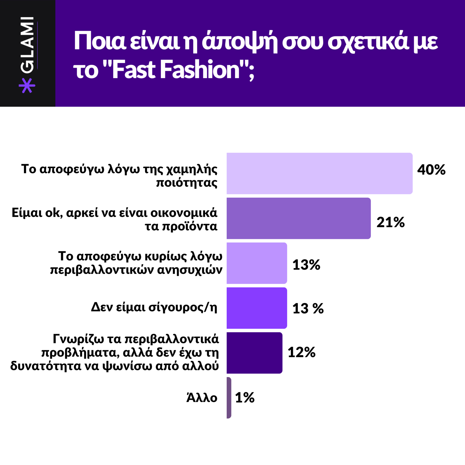40% των Ελλήνων καταναλωτών που έλαβαν μέρος στην έρευνα Fashion (Re)search του GLAMI προβληματίζεται για την ποιότητα των fast fashion προϊόντων ενώ το 21% δεν εστιάζει σε αυτήν – τους αρκεί που είναι πιο οικονομικά. Ο αντίκτυπος της «γρήγορης μόδας» στο περιβάλλον παρουσιάζεται ως τρίτη, κατά σειρά, ανησυχία για το 13% των συμμετεχόντων ενώ σε ποσοστό 12%, οι Έλληνες κατανaλωτές απαντούν πως παρότι γνωρίζουν τα περιβαλλοντικά προβλήματα που επιφέρει η πολιτική του fast fashion, σε ποσοστό 12% δεν έχουν τη δυνατότητα να ψωνίσουν από αλλού.