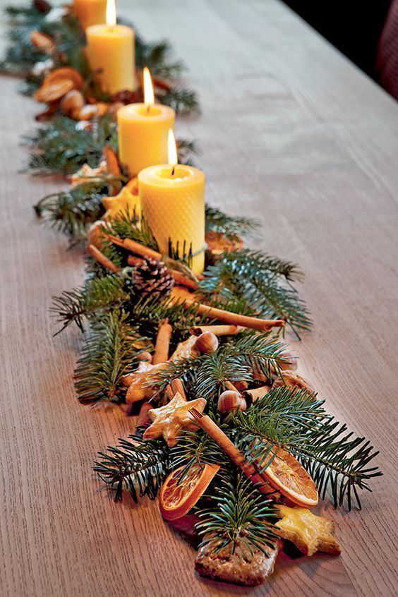 Η λεπτομέρεια που κάνει τη διαφορά είναι τα αρωματικά κεριά. Μπορείτε να προμηθευτείτε κεριά σε σχήμα αστεριού ή χριστουγεννιάτικου δέντρου με άρωμα κανέλας, βανίλιας. Μπορείτε, φυσικά, να βάλετε και απλά κεριά σε έναν δίσκο με κλαδιά από γκι και φωτάκια. Φέτες αποξηραμένων πορτοκαλιών δίνουν εξτρά αρώματα.