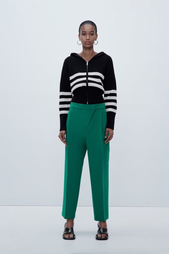 Πρόκειται για ένα ψηλόμεσο παντελόνι με πιέτες, σε ίσια γραμμή, που κολακεύει απίστευτα το σώμα και φοριέται όλες τις ώρες της ημέρας. Σε θεϊκό πράσινο χρώμα, ταιριάζει μοναδικά με πουκάμισο, crop top και σακάκι, αλλά και ένα ζεστό πουλόβερ για τις κρύες μέρες.