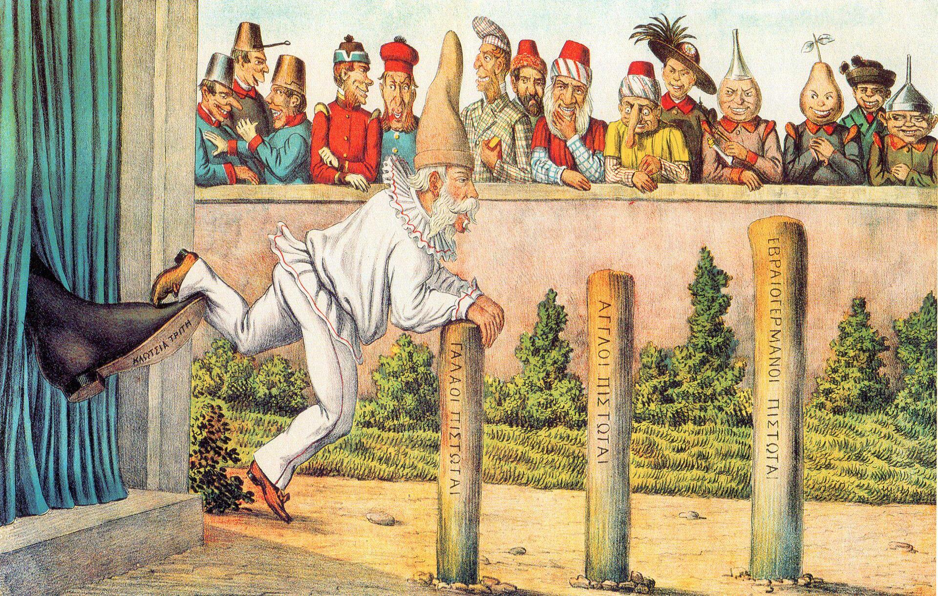 Ο «Νέος Αριστοφάνης» παρουσιάζει τον πρωθυπουργό Δεληγιάννη να λαμβάνει μέρος στα τελευταία Ολύμπια του 1888 αγωνιζόμενος στο αγώνισμα του πηδήματος των παλουκιών των ξένων πιστωτών στο οποίο ξεχωρίζουμε ως λαός…