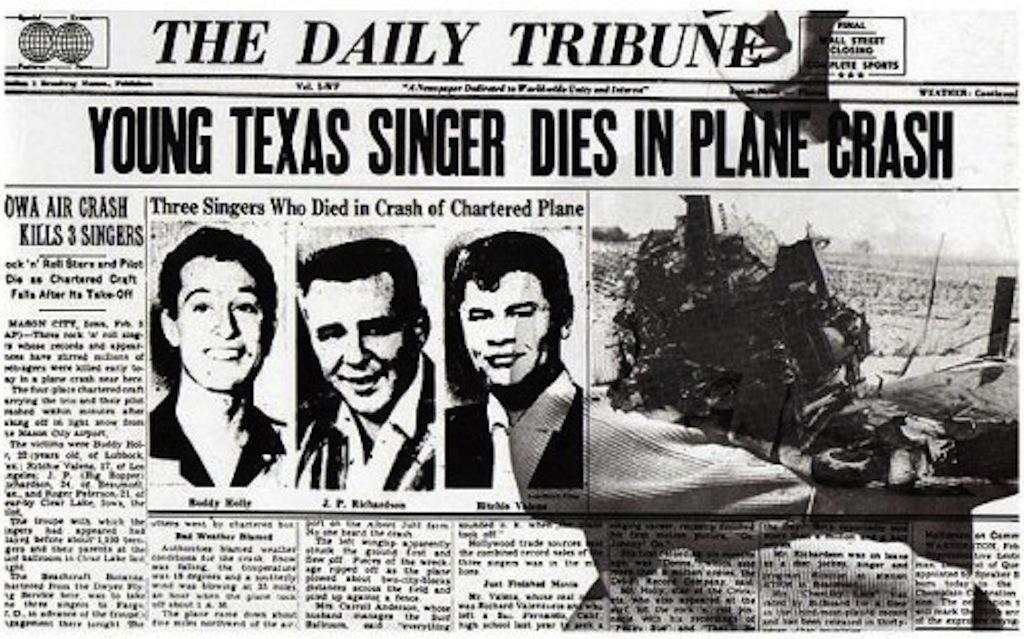 Τρεις μεγάλοι αστέρες της Rock and Roll, ο Μπάντι Χόλι, ο Ρίτσι Βάλενς και ο Τζάιλς «Μπιγκ Μπόπερ» Ρίτσαρντσον έχασαν τη ζωή τους σε αεροπορικό δυστύχημα προκαλώντας παγκόσμιο σοκ.