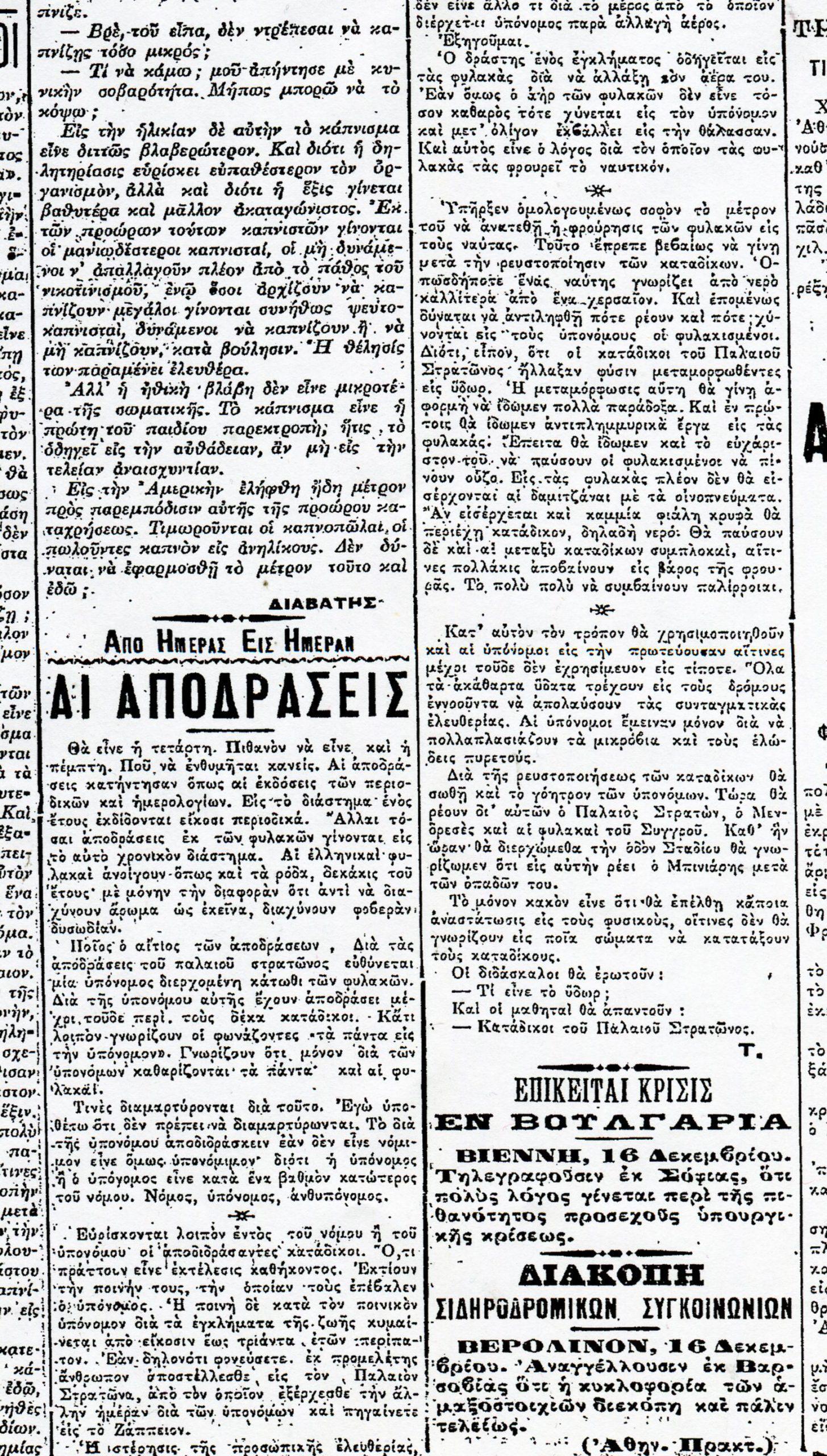 Δια δε την υπόνομον ταύτην εχρειάσθησην εννέα μήνας και 2.700 δραχμάς. Τέλος, αφού η υπόνομος ετοιμάσθη καθ’ όλα, και η εργασία αυτής έληξε την 1ην του τρέχοντος μηνός, έκοψαν τα μαλλιά των, εξυρίσθησαν όλοι, συνέφαγον αδελφικώς και δοθείσης της ευκαιρίας, την 3ην, ως εν παρόδω ειρήσθω, τρέχοντος μηνός και την 10ην νυχτερινήν ώραν, άπαντες εξήλθον ανενόχλητοι, ωσάν να εξήρχοντο από τα σπίτια των».