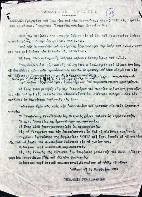 Σε ένα άλλο ενημερωτικό «δελτίο δράσεως» της Υποδιεύθυνσης Γενικής Ασφάλειας (3 Νοεμβρίου 1961) σημειώνονται, αποσπασματικά: «…κατά την περίοδο της Κατοχής ανήκεν εις το ΕΑΜ του Μαιευτηρίου δράσας ποικιλοτρόπως διά την επικράτησιν του ΚΚΕ. Κατά την καταστολήν του κινήματος εξηκολούθησε την υπέρ του ΚΚΕ δράσιν του και απέσχε των εκλογών της 31/3/1946. (…). Το έτος 1958 μεταβάς είς την ιδιαιτέραν του πατρίδαν διήνειμεν ψηφοδέλτια της ΕΔΑ και εις φιλικόν του κύκλον είπεν ότι διέπραξε σφάλμα διότι δεν κατήλθεν ως υποψήφιος βουλευτής της ΕΔΑ. Διάκειται εχθρικώς προς την Αστυνομίαν και γενικώς εις τους Στρατιωτικούς. Η Υποδ/νσις Γεν. Ασφαλείας Πειραιώς φέρει τούτον ως κομμουνιστήν. Η Δ.Χ Αρκαδίας ως αμετανόητον κομμουνιστήν. Το έτος 1958 επανεχαρακτηρίσθη ως κομμουνιστής. Εις το ιατρείον του τον επισκέπτονται ως επί το πλείστον κομ/σταί. (…). Πρόκειται περί δεινού κομμουνιστού, δυναμένου να πράξη το παν».