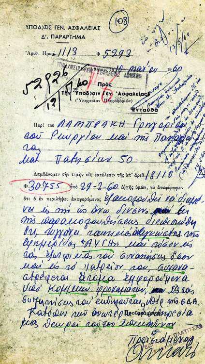 Μάλιστα, σε ένα -από τα πολλά που περιλαμβάνονται στο φάκελο- έγγραφα της Υποδιεύθυνσης Γενικής Ασφάλειας που σήμερα δημοσιεύει ο Ελεύθερος Τύπος, αναφέρονται τα εξής: «Εκ της παρακολουθήσεως διεπιστώθη ότι τυγχάνει τακτικός αναγνώστης της εφημερίδας ΑΥΓΗ και τόσον εις τας εξωτερικάς του συναντήσεις όσον και εις το ιατρείον του, συναναστρέφεται άτομα εμφορούμενα υπό κομμ/κών φρονημάτων, εις τας συζητήσεις του εκδηλούται υπέρ της ΕΔΑ. Κατόπιν των ανωτέρω η υπηρεσία μας θεωρεί τούτον επικίνδυνον».