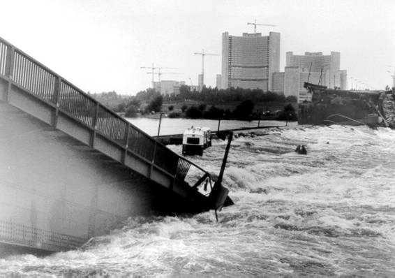 Η “Ράιχσμπριουκε”, η γέφυρα που είχε αντέξει τόσους πολέμους, σαρώθηκε σε όλο το μήκος της από τα νερά του Δούναβη στις 4.46 τοπική ώρα της 1ης Αυγούστου του 1976, παρασύροντας μαζί της μικρό φορτηγό αυτοκίνητο και τον οδηγό του στον υγρό τάφο, ενώ από θαύμα σώθηκε ο οδηγός ενός αστικού λεωφορείου, το οποίο έμεινε επάνω στα συντρίμμια της γέφυρας, με την χαρακτηριστική εκείνη φωτογραφία να κάνει τότε τον γύρο του κόσμου.