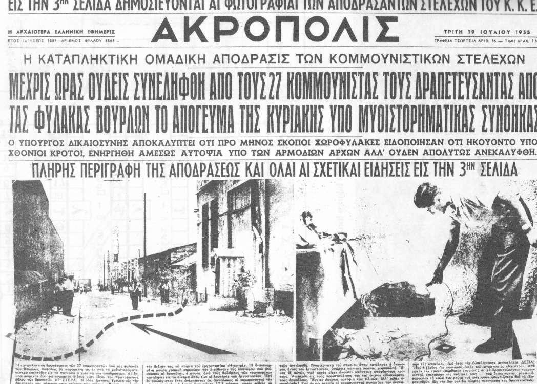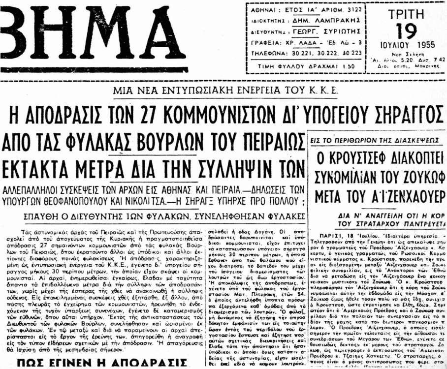 «Υπό τα βλέμματα της “ισχυράς” κυβερνήσεως – 27 κομμουνισταί απέδρασαν εκ των φυλακών Βούρλων υπό μυθιστορηματικάς συνθήκας – Από διανοιγείσαν υπόγειον σήραγγα διέφυγον εις παρακείμενον εργοστάσιον», έγραψε η εφημερίδα Ελευθερία.