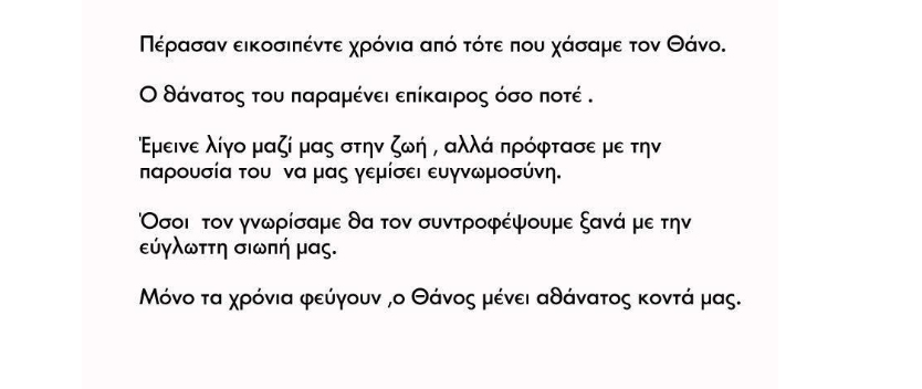 Σε μήνυμά της η οικογένεια αναφέρει ότι ότι «ο θάνατός του παραμένει πιο επίκαιρος όσο ποτέ. Έμεινε λίγο μαζί μας στην ζωή, αλλά πρόφτασε με την παρουσία του να μας γεμίσει ευγνωμοσύνη. Όσοι τον γνωρίσαμε θα τον συντροφέψουμε ξανά με την εύγλωττη σιωπή μας. Μόνο τα χρόνια φεύγουν, ο Θάνος μένει αθάνατος κοντά μας».