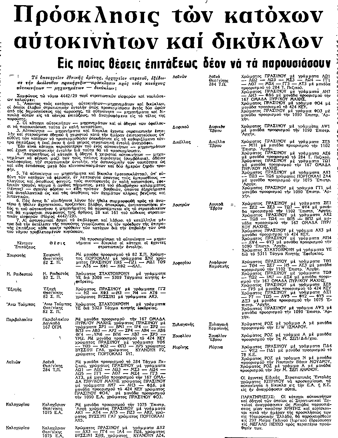 Μπορεί αυτό ν’ αποτελεί συνήθη πρακτική σε περιπτώσεις επιστράτευσης, αλλά σίγουρα δεν συνηθίζεται (και δεν χωνεύεται…) η υποχρέωση των κατόχων να παραδώσουν τα οχήματά τους, σε άψογη κατάσταση, γεμισμένα με βενζίνη, αλλαγμένα λιπαντικά, με ρεζέρβα και με πλήρη ανταλλακτικά κι όλα αυτά μέσα σε δύο ώρες, υπό το φόβο του στρατοδικείου…