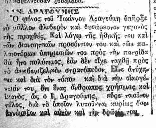 Οι πληροφορίες που αναφέρει την επόμενη ημέρα ο συμπολιτευόμενος Τύπος για τη εκτέλεση Δραγούμη, δεν έχουν ουδεμία σχέση με την πραγματικότητα : «…συλληφθείς υπό των στρατιωτών, δυνάμει εντάλματος των αρχών, ενώ οδηγείτο εις τα φυλακάς, αντέστη και μάλιστα επιχείρησε να φύγει, πυροβολήσας κατά των φρουρών. Ένεκα τούτου εις των στρατιωτών ελόγχισε τον Δραγούμην και τον ετραυμάτισε σοβαρώς. Μεταφέρθει κατόπιν εις το Στρατιωτικόν Νοσοκομείον όπου εξέπνευσε εκ του τραύματος του περί την 6ην μ.μ».