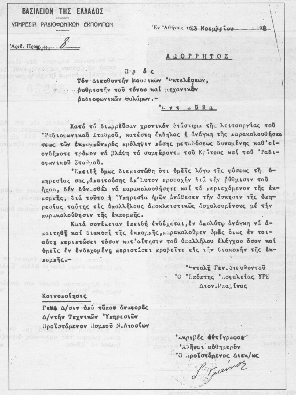 Κατά συνέπειαν επειδή ενδέχεται, εν απολύτω ανάγκη να απαιτηθή και διακοπή της εκπομπής, παρακαλούμεν υμάς όπως εν τοιαύτη περιπτώσει τόσον κατ’ αίτησιν του υπαλλήλου ελέγχου όσον και υμείς εν ενδεχομένη περιστάσει προβείτε εις την διακοπήν της εκπομπής.
