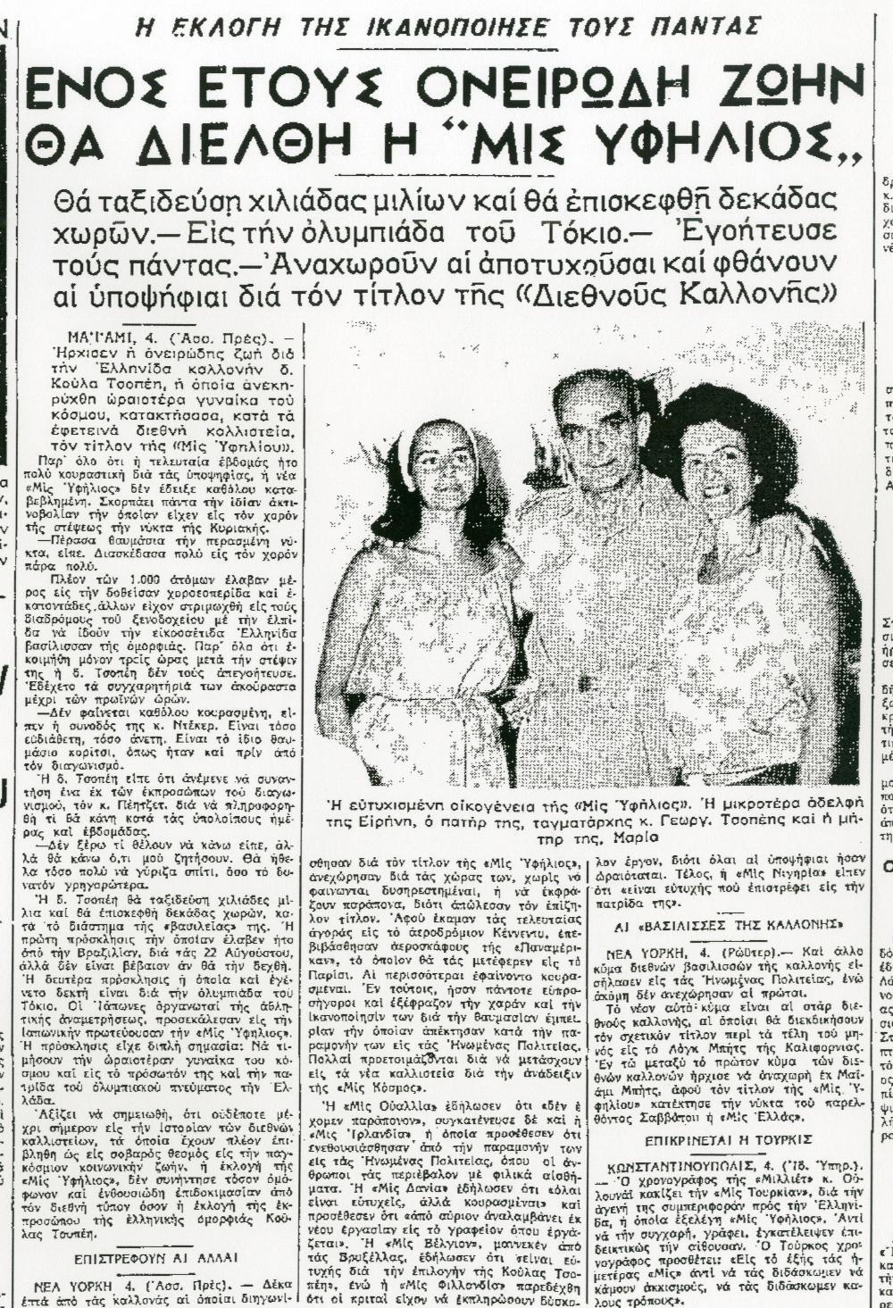 Μόνη, αλλά κυκλωμένη από φωτογράφους, δημοσιογράφους, κινηματογραφικούς παραγωγούς, μάνατζερ και ….υποψήφιους γαμπρούς, στις πρώτες της δηλώσεις η ελληνίδα καλλονή αναφέρει πως θα δώσει τα χρήματα του βραβείου στην οικογένειά της, και ότι βιάζεται να επιστρέψει κοντά τους. Στην πραγματικότητα όμως, αυτό θ’ αργήσει πολύ να γίνει, αφού δεν έχει ακόμα συνειδητοποιήσει ότι ο τίτλος της μις Υφήλιος έχει τόσο ασφυκτικές υποχρεώσεις για τον επόμενο χρόνο, που λίγο διάστημα αργότερα δηλώνει κουρασμένη :«Για μια βασίλισσα της ομορφιάς είναι πολύ βαρύ το τίμημα της εφήμερης βασιλείας της. Θα προτιμούσα να μην είχα εκλεγεί βασίλισσα».