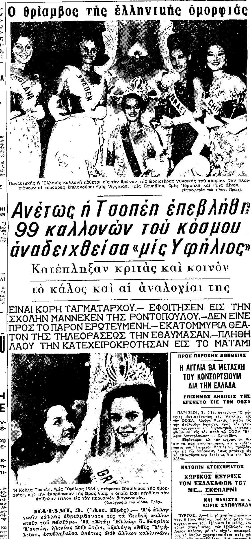 Η, για πρώτη φορά, μετάδοση του διαγωνισμού από την αμερικανική τηλεόραση του δίνει ξεχωριστή λάμψη, αφού τον παρακολουθούν από πάνω από 60 εκατ. τηλεθεατές. Η Τσοπέη, ξεχωρίζει αμέσως ανάμεσα σε δεκάδες άλλες κοπέλες απ’ όλο τον κόσμο, και βρίσκεται στην πρώτη πεντάδα μαζί με αυτές από Κίνα, Σουηδία, Ισραήλ και Αγγλία. Στο άκουσμα της πρωτιάς αισθάνεται απόλυτη μοναξιά, αφού βρίσκεται στη κορυφή του κόσμου, χωρίς να έχει δίπλα κανένα δικό της άνθρωπο να μοιραστεί τη χαρά της. Παράλληλα, αντιμετωπίζει τη ζήλια της μις Τουρκία, που – επηρεασμένη από το πολεμικό κλίμα μεταξύ Ελλάδας- Τουρκίας της εποχής- αποχωρεί από την τιμητική εκδήλωση για τη νικήτρια κάνοντας δηλώσεις εναντίον της. Για να ηρεμήσει και να δώσει συγχαρητήρια στη ελληνίδα χρειάζεται να λάβει τηλεγράφημα από την Τουρκία.