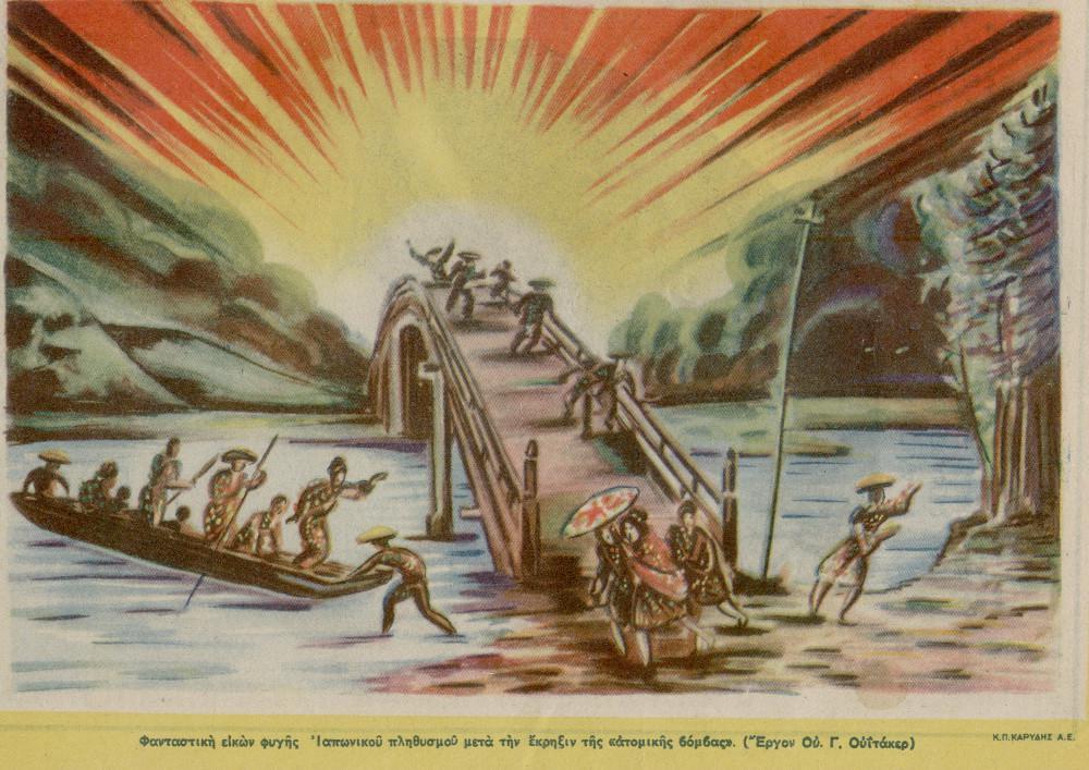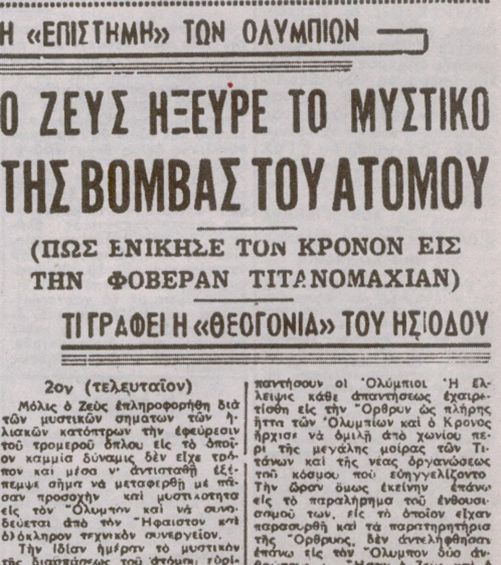 Χαρακτηριστικά η «Βραδυνή» των ημερών δημοσιεύει σε δύο συνέχειες μια παρόμοια γλαφυρή ιστορία : «Μόλις ο Δίας επληροφορήθη δια των μυστικών σημάτων των ηλιακών κατόπτρων την εφεύρεσιν του τρομερού όπλου εις το οποίον καμία δύναμις δεν είχε τρόπον και μέσα να αντισταθεί εξέπεμψε σήμα να μεταφερθεί με πάσαν προσοχήν και μυστικότητα εις τον Όλυμπον, και να συνοδεύεται από τον Ήφαιστον και ολόκληρον το τεχνικόν συνεργείον. Την ίδιαν ημέραν το μυστικόν της διασπάσεως του ατόμου, ευρίσκετε είς τας χείρας του Διός. Η τρομερά δύναμις που ημπορούσε να καταστρέψει χώρας, πόλεις, και την γην ολόκληρον ήτο εις τας χείρας του Κεραυνίου Διός».
