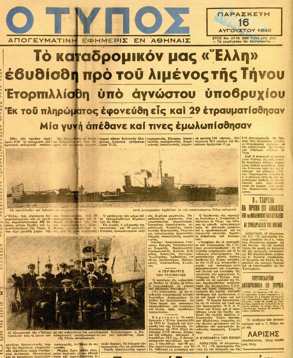 Ο κυβερνήτης του «Έλλη» αναφέρει χαρακτηριστικά :«Αν η τορπίλα χτυπούσε το καράβι πέντε ακόμα μέτρα την πλώρη, θ’ έβρισκε την αποθήκη των πυρομαχικών, το καράβι θα τιναζόταν στο αέρα, δεν θα έμενε τίποτα όρθιο στην πολιτεία και τα θύματα θα ήσαν άπειρα. Μα είχε σκάσει ακριβώς στο ύψος του τρίτου καζανιού.