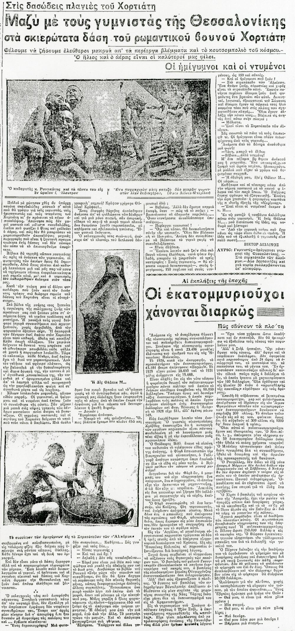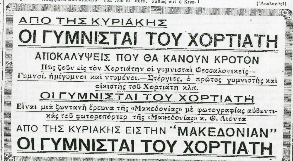 Το καλοκαίρι του 1932 η εφημερίδα «Μακεδονία» διαφημίζει επί ημέρες το επερχόμενο τολμηρό ρεπορτάζ της με τον εντυπωσιακό τίτλο: «Οι γυμνισταί του Χορτιάτη», γράφοντας για πολυήμερο αφιέρωμα σε γνωστούς θεσσαλονικείς που γυρίζουν γυμνοί στο δάσος του Χορτιάτη: «Εις διάφορα σημεία του Χορτιάτη έχουν στηθεί σκηνές από ιδιώτες εις σχετική απόστασην η μία από την άλλην, στεγάζουσα μια δεκάδα γυμνιστών, προσώπων λίαν γνωστών εις την κοινωνίαν της Θεσσαλονίκης». Την πρώτη ημέρα της δημοσίευσης ο δημοσιογράφος «ανακαλύπτει» ανάμεσα σε δύο καστανιές ένα μελαχρινό νέο να κάνει Σουηδική γυμναστική κάτω από τον καυτό ήλιο, υποσχόμενος ότι τις επόμενες ημέρες θα συνοδεύσει το ρεπορτάζ με αποκλειστικές φωτογραφίες.