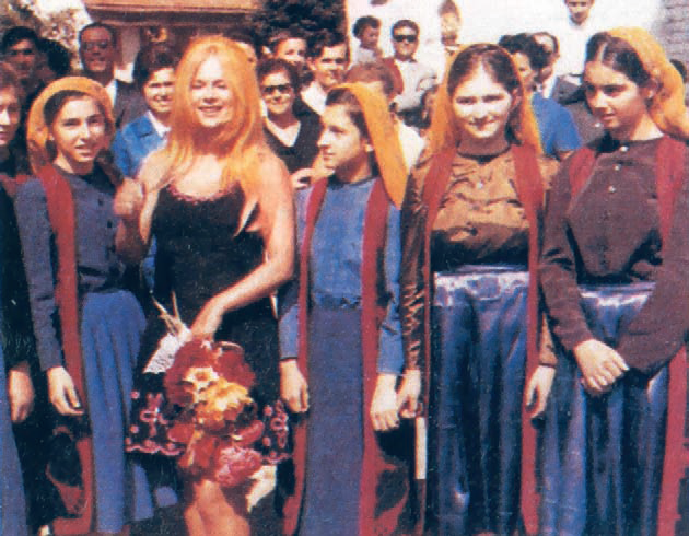 Στο λιμάνι την περιμένει πλήθος θαυμαστών, τους οποίους, αυτή τη φορά, δεν αποφεύγει. «Είναι πολύ συγκινητικό να βλέπεις του απλούς ανθρώπους του νησιού να παρατούν τις δουλειές τους και να στριμώχνονται στην αποβάθρα για να πουν το “καλώς όρισες” στους δύο δημοφιλείς πρωταγωνιστές», αναφέρει το ρεπορτάζ της εποχής. Η μεγάλη παρέα του ζευγαριού, μαζί με πολλούς ντόπιους, ανεβαίνει με τα πόδια τον ανηφορικό δρόμο που οδηγεί στον Ιερό Ναό της Ευαγγελίστριας.