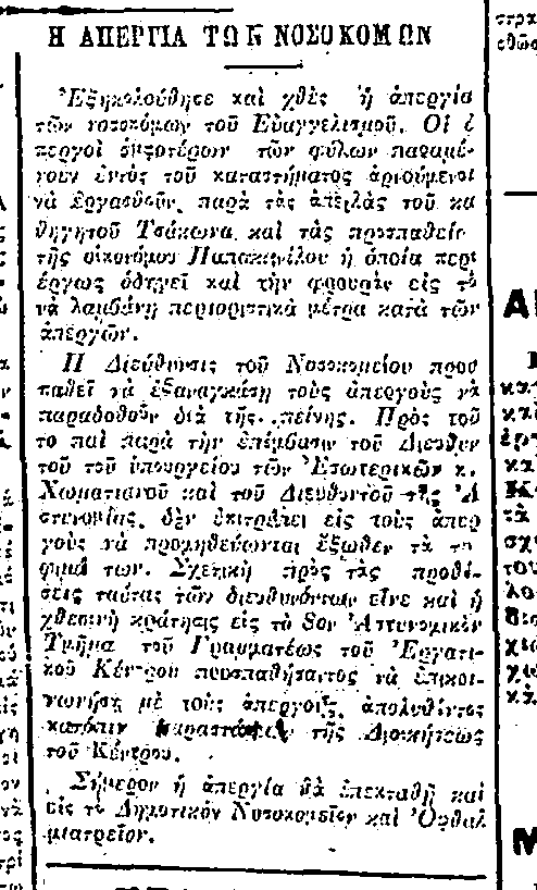 Ένα μήνα μετά την έναρξή της, πλέον η απεργία επεκτείνεται σε Δημοτικό Νοσοκομείο Αθηνών και Οφθαλμιατρείο, ενώ το Εργατικό Κέντρο Αθηνών ζητά από την Ομοσπονδία Ηλεκτρισμού Ηλεκτροκινήσεως και Φωταερίου «…να παύσει γενικώς η παροχή του ρεύματος εις όλον το ίδρυμα εάν δεν ήθελε δοθεί φωτισμός στους απεργούς». Τελικός απολογισμός αυτής της απίστευτης ιστορίας ; Οι νοσοκόμες δεν απολύονται, και κάποια ψιχία των αιτημάτων τους γίνονται δεκτά…