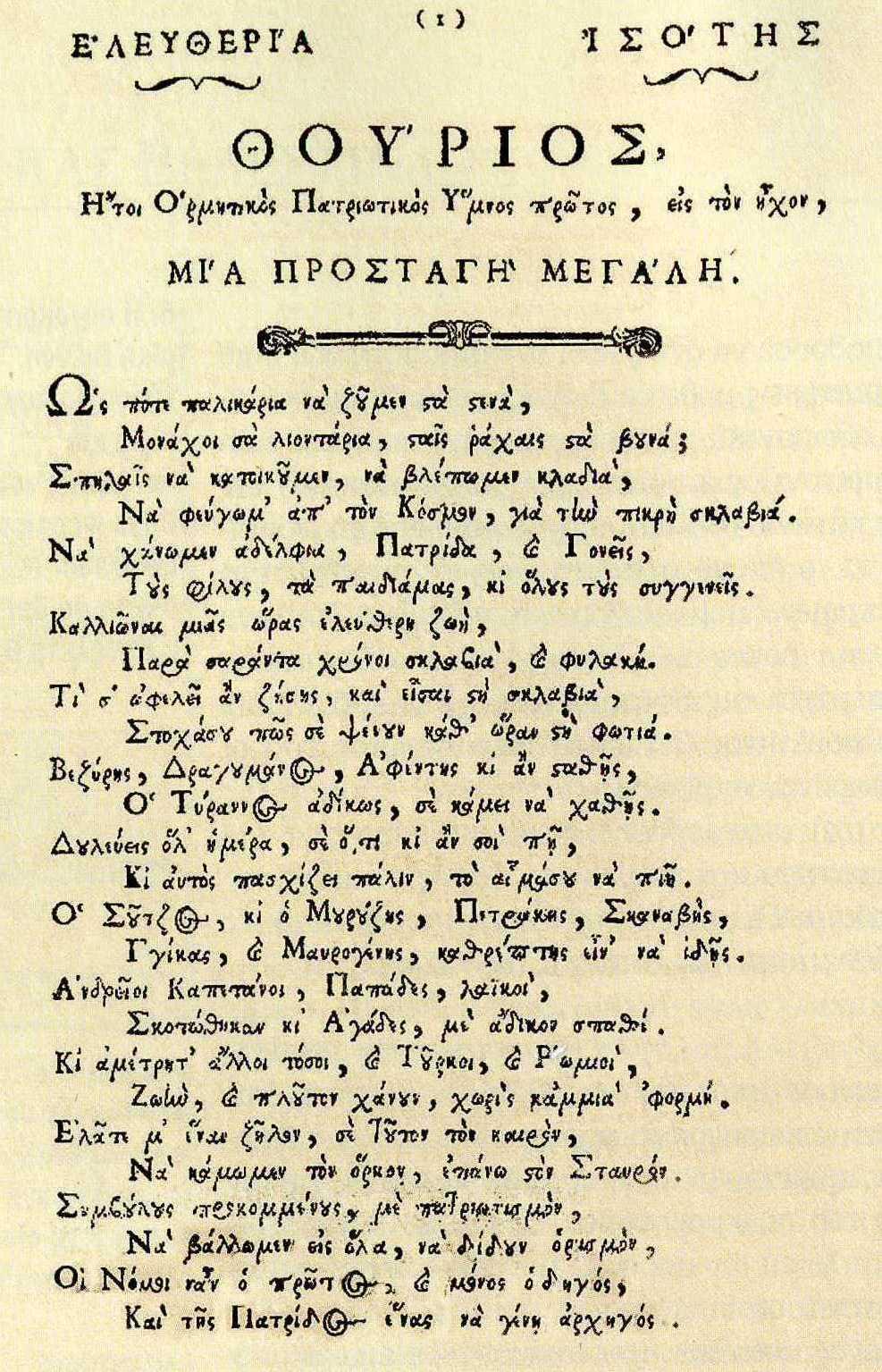 Οι πρώτοι στίχοι του εμβληματικού έργου του Ρήγα «Θούριος» σε έκδοση που τυπώνεται στην Κέρκυρα το έτος δολοφονίας του.