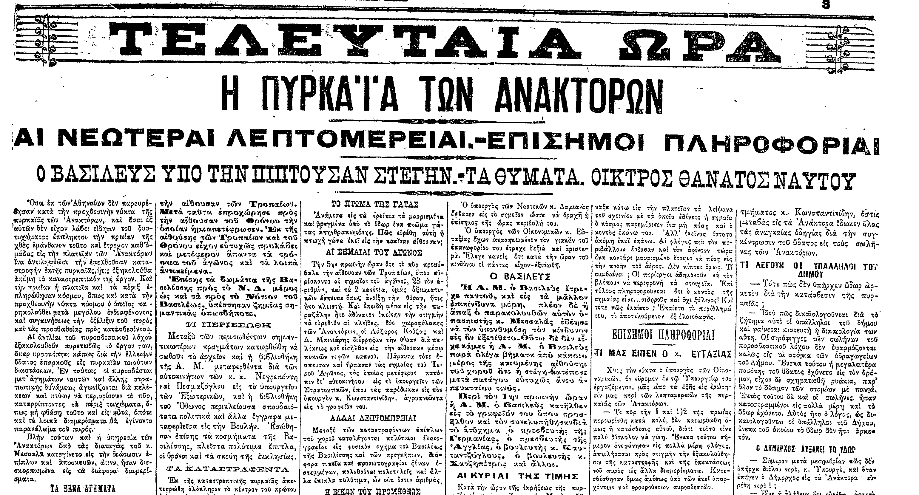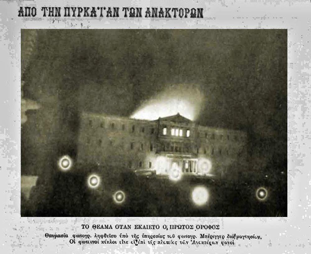 Η φωτιά σαρώνει για δύο μέρες το εμβληματικό κτίριο της πρωτεύουσας που ποτέ δε θα είναι ίδιο. Πλέον, η βασιλική οικογένεια μεταφέρεται αρχικά στο Τατόι και εν συνεχεία στην οδό Ηρώδου Αττικού, ενώ το κτίριο αλλάζει πολλές χρήσεις μέχρι να μετατραπεί το 1935 σε Βουλή των Ελλήνων.