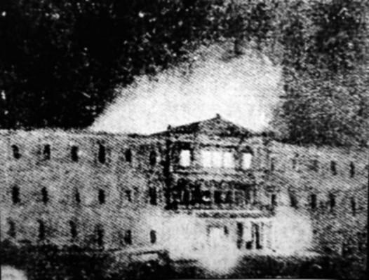 Τότε, στις 21:30 ξεσπά μεγάλη πυρκαγιά στο σημερινό μέγαρο του κοινοβουλίου, που τότε στεγάζει τα βασιλικά ανάκτορα.