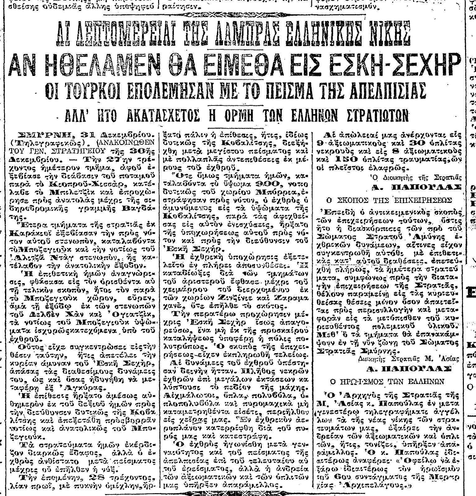 Λίγοι δίνουν βαρύτητα στο πρωτοχρονιάτικο μήνυμα του αυτοεξόριστου στη Νίκαια της Γαλλίας Βενιζέλου, που «προφητεύει» τη μεταμέλεια των βασιλικών ψηφοφόρων όταν δουν Θράκη και Σμύρνη ν’ αποσπώνται από την Ελλάδα. Στη πραγματικότητα η επερχόμενη καταστροφή θα είναι ακόμα μεγαλύτερη, αλλά ακόμα ο κόσμος ζώντας στη μέθη της προέλασης του ελληνικού στρατού στο Μικρασιατικό μέτωπο γιορτάζει τον ερχομό του νέου έτους.