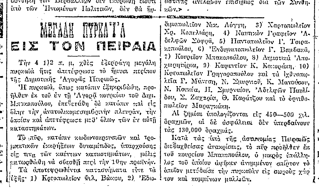 Το Πρωτοχρονιάτικο λαχείο της εποχής ονομάζεται «Εθνικού Στόλου και Αρχαιοτήτων», και στη κλήρωση που γίνεται την πρώτη Ιανουαρίου στα γραφεία της αρχαιολογικής εταιρίας, ο πρώτος λαχνός κερδίζει 80.000 δρχ. ενώ ο δεύτερος 20.000 δρχ. Όμως, παρά τις προσδοκίες η νέα χρονιά δεν ξεκινά καλά, αφού το βράδυ της Πρωτοχρονιάς μεγάλη πυρκαγιά που ξεκινά από κουρείο καίει πάνω από την μισή δημοτική αγορά του Πειραιά.