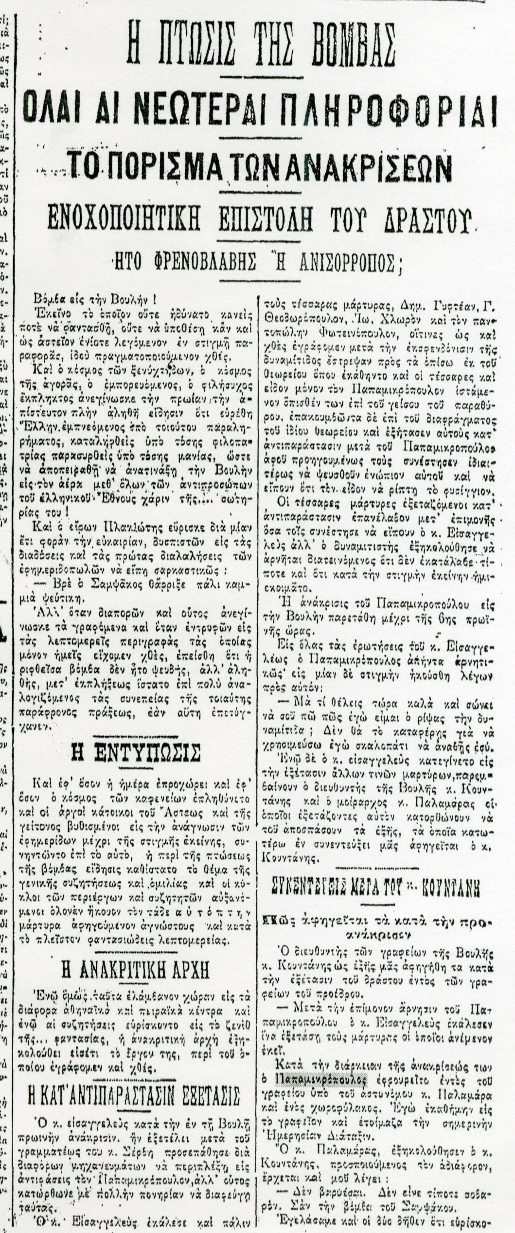 «Το φυσίγγιο έπεσε στα πόδια των Μαυρομιχάλη, Τριανταφυλλάκου, Λεωπούλου, ήτο δε από εξ εκείνων, τα οποία μεταχειρίζονται οι αλιείς, αν δε τούτο ήναπτε, θα εφονεύοντο ή θα ηκρωτοριάζοντο οι βουλευτές ούτοι αφεύκτως. Καθ’ ήν στιγμήν έπεσε το φυσίγγιον, εις το θεωρείον ήσαν ελάχιστοι και ο κατηγορούμενος εφαίνετο τεταραγμένος όταν τον επλησιάσαμεν εγώ και ο κ Κουντάνης διευθυντής της Βουλής».