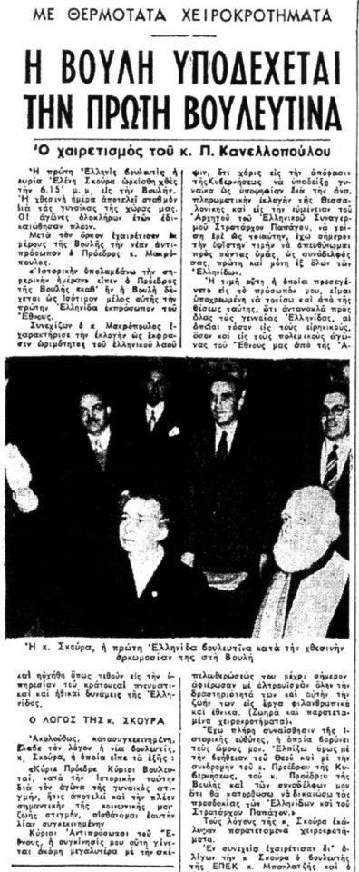 Ομως, η οριστική δικαίωση του γυναικείου φύλου θα έρθει με το νόμο 2159 του 1952 που κατοχύρωνε το δικαίωμα του εκλέγειν και εκλέγεσθαι για όλες τις γυναίκες. Ακόμα κι έτσι, όμως, αυτές δεν καταφέρνουν να συμμετάσχουν στις εκλογές του Νοεμβρίου του 1952 λόγω, πάλι, της μη ενημερότητας των εκλογικών καταλόγων. Δύο μήνες μετά, όμως, στις 18 Ιανουαρίου 1953, στις επαναληπτικές εκλογές που διεξάγονται μόνο για μία έδρα στη Θεσσαλονίκη, υπάρχουν, εκτός από τις ψηφοφόρους, και δύο υποψήφιες βουλευτές. Η Ελένη Σκούρα με τον Ελληνικό Συναγερμό και η Βιργινία Ζάννα με το Κόμμα Φιλελευθέρων. Στην πρωτόγνωρη για τα μέχρι τότε ελληνικά δεδομένα κατάσταση, επικρατεί η πρώτη και κατακτά την πρώτη γυναικεία βουλευτική έδρα λαμβάνοντας 47.132 σταυρούς, έναντι 24.046 σταυρών της κ. Ζάννα.