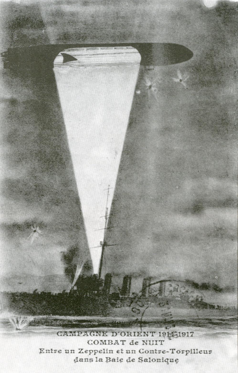 Όταν κατά τις 3 τα ξημερώματα το Ζέπελιν φτάνει στις όχθες του Αξιού ποταμού, ανάβουν οι εγκατεστημένοι σε διάφορα σημεία της πόλης προβολείς, μαζί με αυτούς των συμμαχικών πλοίων που βρίσκονται αγκυροβολημένα στο Θερμαϊκό κόλπο.