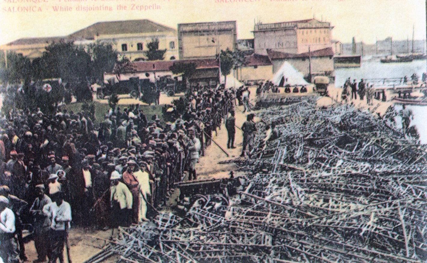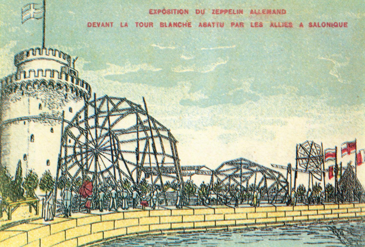 Κάρτ ποστάλ της πόλης με το Ζέπελιν να κείτεται δίπλα στο Λευκό Πύργο.