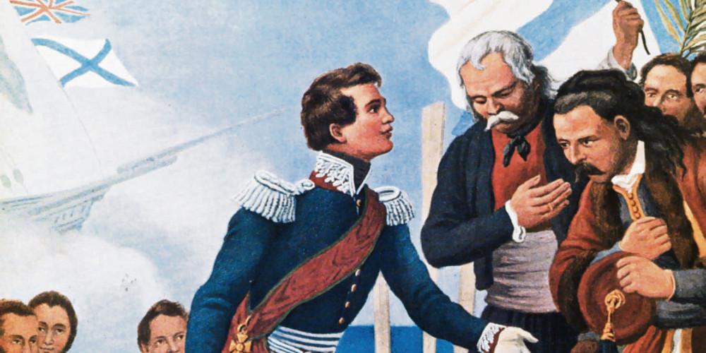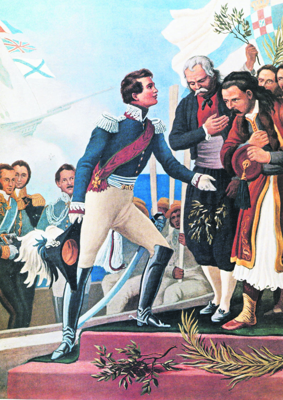 Ο νεαρός βασιλιάς, φορώντας γαλάζια στολή με κόκκινη ταινία, επιβιβάζεται μαζί με τους αντιβασιλείς σε βάρκα που τους οδηγεί στη στεριά, ενώ οι κανονιοβολισμοί των πολεμικών πλοίων δίνουν πανηγυρικό τόνο στην τελετή. Ενα περίεργο κράμα αμηχανίας και μοίρας οδηγεί τον Οθωνα να σκοντάψει στο πρώτο βήμα που κάνει στην ελληνική γη, αλλά συγκρατείται για να μην πέσει από Γάλλο στρατιώτη. Ως ένδειξη τιμής και υπακοής, πρώτος ο Θεόδωρος Κολοκοτρώνης αφήνει τα άρματα στα πόδια του. Η περίοδος της Βαυαροκρατίας έχει ξεκινήσει…