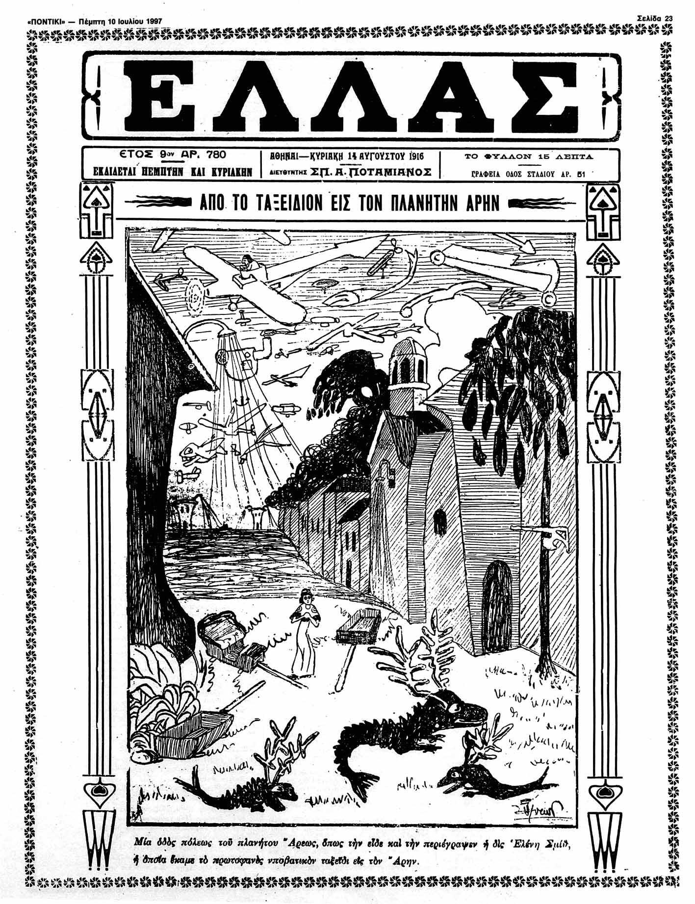 Για να μη σας κρατάμε περισσότερο σε αγωνία -και χωρίς να γνωρίζουμε πόσο βαριά είχε φάει το προηγούμενο βράδυ η «ολίγων νευρικής κράσεως» δεσποινίς-, ας δούμε τι είδε, τι αντάμωσε στις γειτονιές του Αρη. Αρχικά εκτοξεύεται επιτυχώς στο Διάστημα και, όταν αισθάνεται να φεύγει το κεφάλι από το σώμα της, ρωτά: «Πού πάω;». Επειτα, μια φωνή τής απαντάει: «Εις τον πλανήτην Αρην». Φτάνοντας στον «κόκκινο πλανήτη» τρίβει τα μάτια της διαπιστώνοντας αμέσως ότι βρίσκεται μέσα σε μια οργανωμένη πόλη, της οποίας οι κάτοικοι ζουν πολύ καλύτερα από τους γήινους. «Υπάρχουν ανακαλύψεις της επιστήμης πολύ τελειότερες από τας υπάρχουσας εις την Γην. Αλλά και γενικώς οι όροι της ζωής παρουσιάζουν μια κοινωνίαν πολύ πλέον προοδευμένην και εξελιγμένην από την κοινωνίαν της Γης».