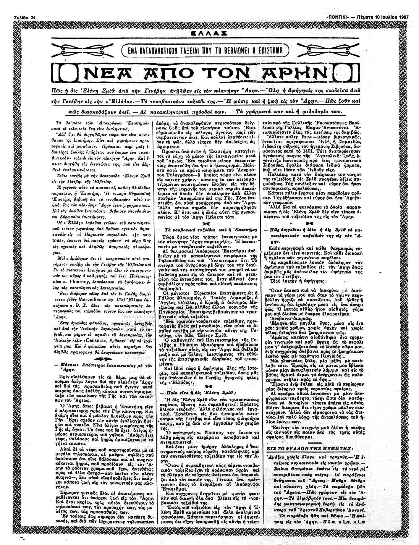 Το 1916 η 30χρονη «φιλήσυχος, έξυπνη και εργατική» υπάλληλος εμπορικού καταστήματος, η δεσποινίς Ελένη Σμιθ, παίρνει μέρος σ’ ένα υπνοβατικό, μεταφυσικό πείραμα στη Γενεύη υπό την εποπτεία Ελβετού πανεπιστημιακού καθηγητή, στο οποίο της ζητείται να βρεθεί στον πλανήτη Αρη και να περιγράψει την εκεί πραγματικότητα… Το θέμα θεωρείται τόσο ενδιαφέρον από την εφημερίδα «Ελλάς», που ζητά από Ελληνα επιστήμονα, που βρίσκεται στην Ελβετία, στοιχεία της ιστορίας και αυτός αποστέλλει στα γραφεία της εφημερίδας έναν πολυσέλιδο φάκελο με λεπτομέρειες του υπνωτικού πειράματος, το οποίο γίνεται πρωτοσέλιδο και δημοσιεύεται σε πολλές συνέχειες.