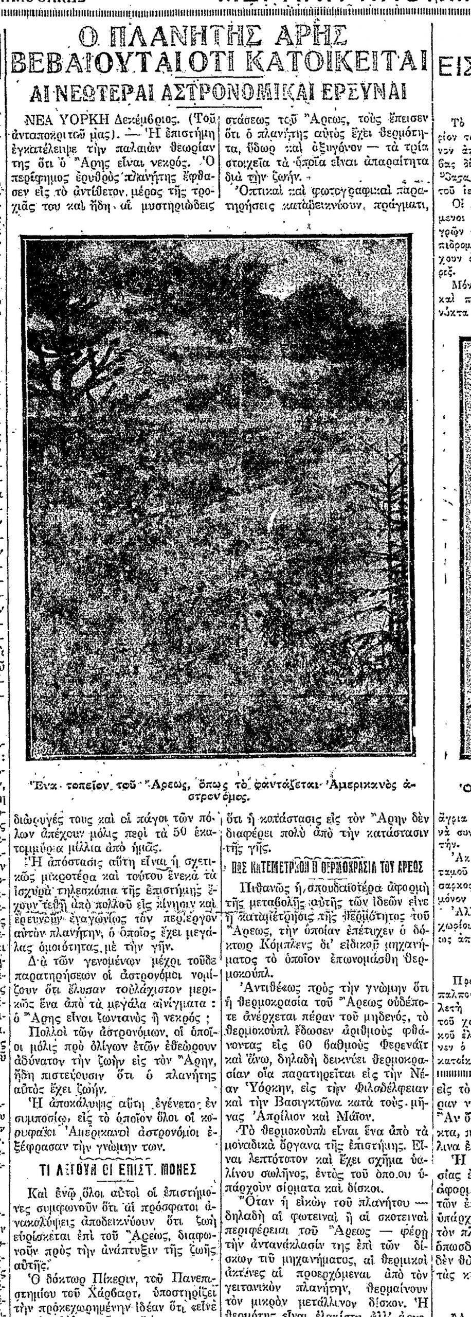 Φυσικά, οι ελληνικές εφημερίδες κάθε άλλο παρά απαθείς μένουν στο φαινόμενο της «Αρεολογίας», που τις περισσότερες φορές ελάχιστα διαφέρει από την αερολογία, αντιμετωπίζοντάς το με χιούμορ. Ενας αρθρογράφος σκέφτεται τις επιπτώσεις που θα υπάρξουν στον δημοσιογραφικό κλάδο: «Θα αρχίσουμε συνεννοήσεις και συγκοινωνίαν και με τον Αρην; Θα επιβαρυνθούν οι εφημερίδες με νέας κολοσσιαίας δαπάνας διά να έχουν καθημερινάς τηλεγραφικάς συνεννοήσεις και από τον γειτονικόν μας πλανήτην; Θα έχωμεν και αποδράσεις των καταδίκων του Παλαιού Στρατώνος εις τον Αρην; Θα έχωμεν και μόδας του Αρεως; Θα αναγιγνώσκομεν κοινωνικά εφημερίδων τα οποία θα λέγουν: “Xθες αφίκνεται εκ του Αρεως ο κ. Τάδε” ή “Χθες ανεχώρησε εις τον Αρην ο έμπορος κ. Δείνα προς προμήθειαν πλουσίας συλλογής θερινών υφασμάτων;”».