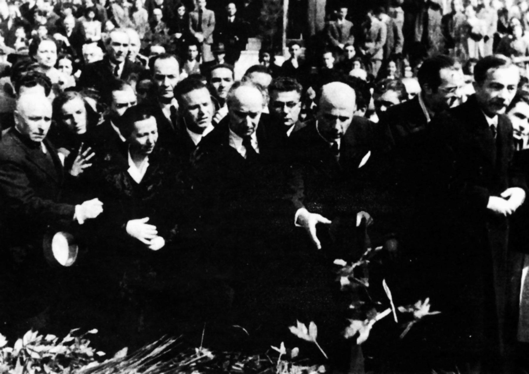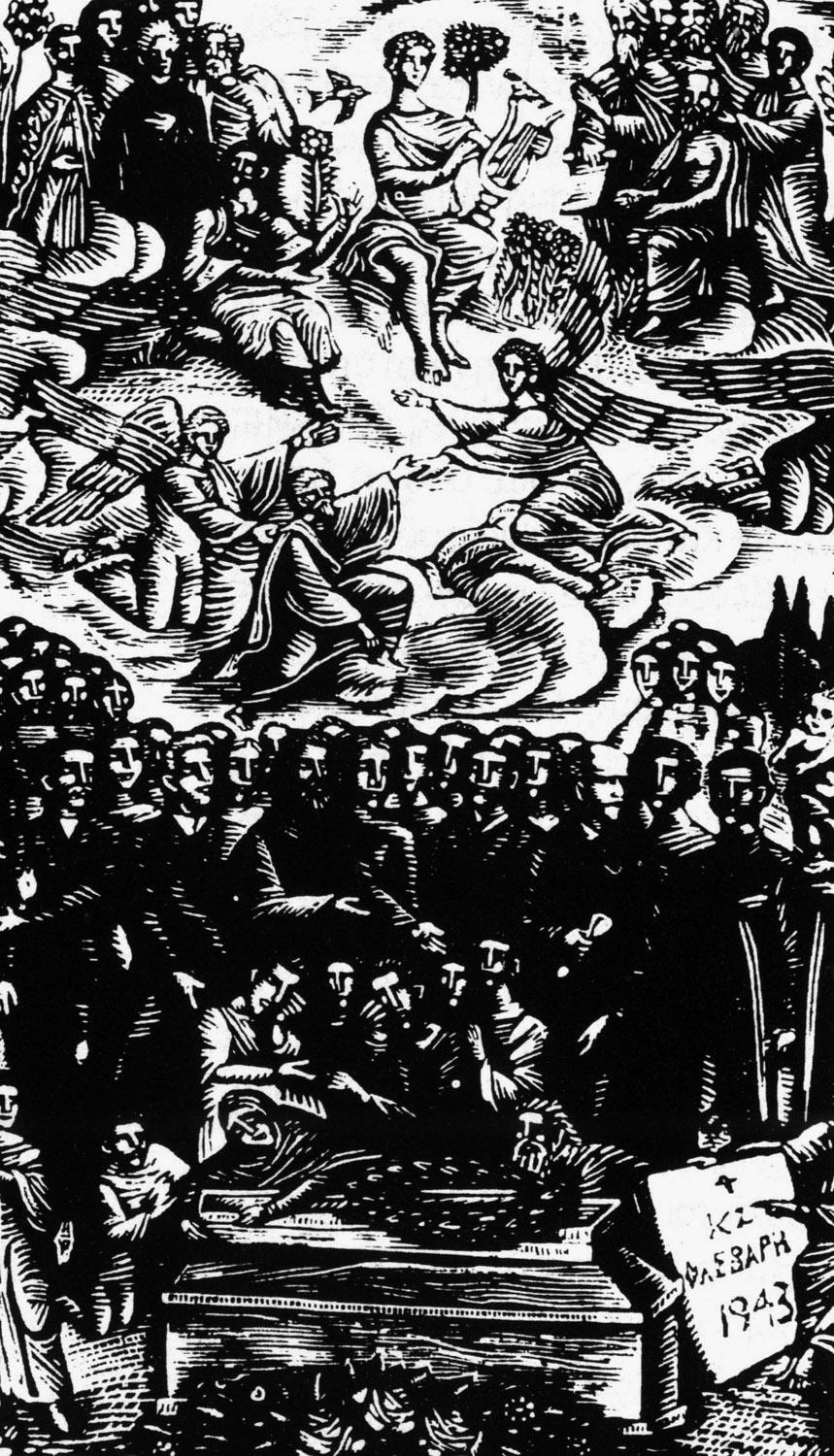Κατεβάζουν το φέρετρο. Ο λαός γονατίζει. Ο Σικελιανός ρίχνει μία φούχτα χώμα. Η Κοτοπούλη άλλη μία. Εγώ επίσης. Γύρω στις άκριες, γραμμές ολόκληρες από καραμπινιέρους και Γερμανούς παραφυλάνε. Μία φοιτήτρια κι ένας γέροντας λιποθυμούν. Να ’ναι απ’ τη συγκίνηση; Ή απ’ την πείνα; Θυμήθηκα τους στίχους του Παλαμά: “Η μεγαλοσύνη στα έθνη δε μετριέται με το στρέμμα, με της καρδιάς το πύρωμα μετριέται και με το αίμα”. Δεν ξέρω αν ο κ. Αλτεμπουργκ είχε υπόψη του αυτούς τους στίχους. Εμείς, πάντως, το πεινασμένο και σκλάβο έθνος είχαμε κάτι άλλο να του πούμε: τον Εθνικό μας Υμνο. Τον αρχίζει πρώτος ο Γεώργιος Κατσίμπαλης και σε λίγο τον παίρνει το ξελευτερωμένο πλήθος και τον σκορπάει στους ανέμους. Αντιβουίζει ο τόπος λευτεριά. Και τρέμουν οι άσπροι σταυροί… Η κηδεία γίνεται Ανάσταση και Καθαρή Δευτέρα…».