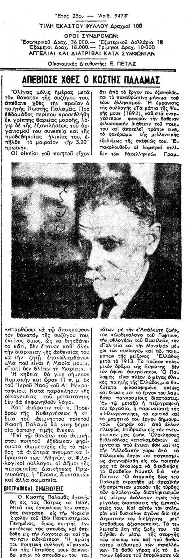 Μέσα σε αυτό το φορτισμένο κλίμα, η είδηση του θανάτου του Κωστή Παλαμά, το έργο του οποίου συσπειρώνει τον Ελληνισμό έναντι των κατακτητών, μετατρέπεται από μήνυμα πένθους σε σάλπισμα ξεσηκωμού. Παρότι λίγες ημέρες πριν οι δυνάμεις κατοχής ανακοινώνουν ότι «πάσα συγκέντρωσις πολιτών θα διαλύεται διά των όπλων» και ο δωσίλογος πρωθυπουργός, Κωνσταντίνος Λογοθετόπουλος, απαγορεύει, επί ποινή θανάτου, την προσέγγιση του γραφείου του από διαδηλωτές την ημέρα της κηδείας, ο κόσμος τούς υποχρεώνει όχι μόνο να πάρουν πίσω τις αποφάσεις, αλλά και να παρευρεθούν και οι ίδιοι στην κηδεία.
