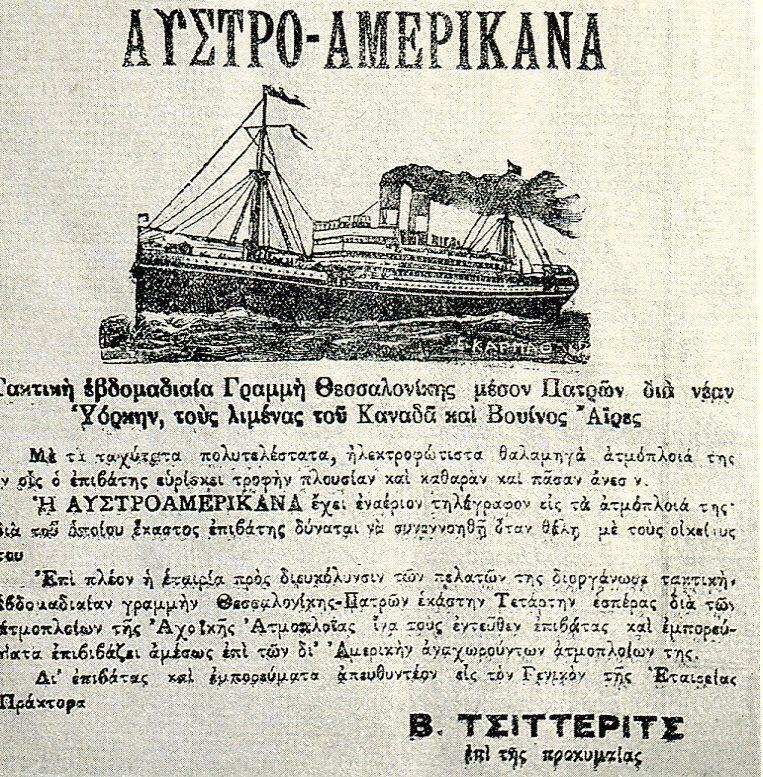Μέχρι το 1907, το μεταναστευτικό κύμα διακινείται αποκλειστικά από ξένες ναυτιλιακές εταιρίες. Τότε, δραστηριοποιούνται στη γραμμή Ελλάδα – ΗΠΑ οι ελληνικές εταιρίες «Μωραΐτης» και «Υπερωκεάνιος Ελληνική Ατμοπλοΐα» οι οποίες όμως σύντομα χρεοκοπούν. Στο χώρο των υπερωκεανίων κυριαρχούν οι αδελφοί Εμπειρίκοι με τα πλοία «Πατρίς», «Ιωάννινα», «Θεσσαλονίκη, «Μεγάλη Ελλάς», «Κωνσταντινούπολις» και «Μωρέας».
