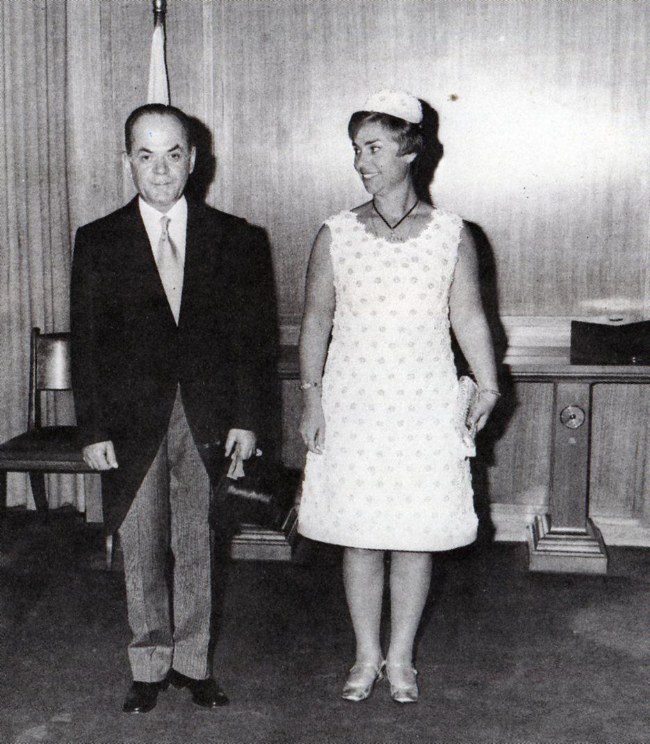 Σε μια από τις πολλές ορκωμοσίες του Παπαδόπουλου τον Ιούλιο του 1973, η νεαρή σύζυγος αναφέρεται στις ενδυματολογικές επιλογές των συζύγων των υπουργών:«Οι γυναίκες των υπουργών, ντυμένες σύμφωνα με την τελευταία λέξη της μόδας, οι περισσότερες φορούν καπέλα. Εγώ έχω διαλέξει ένα άσπρο-μπλε ταγιέρ, με άσπρο καπέλο. Κάνω πιο κυρία».