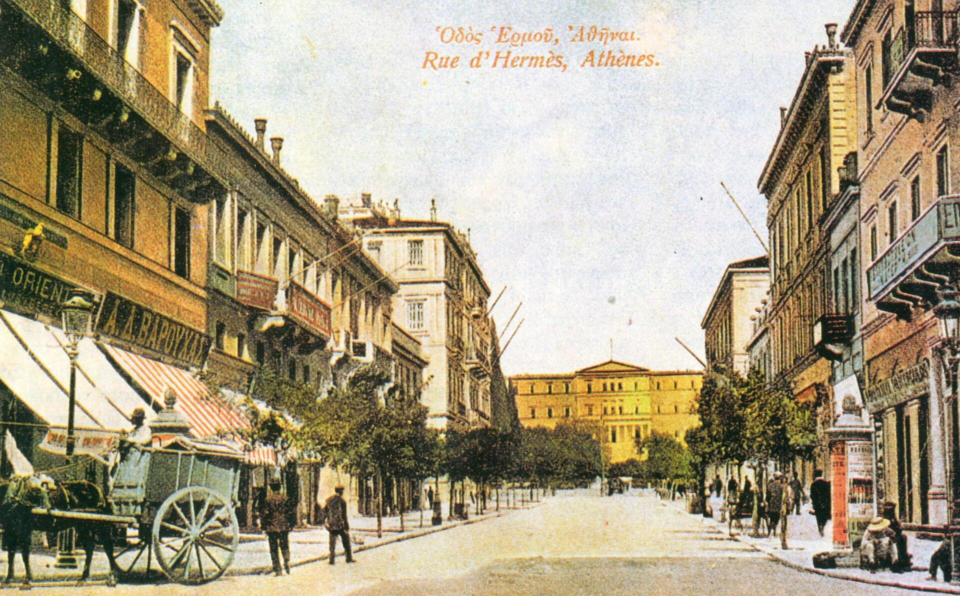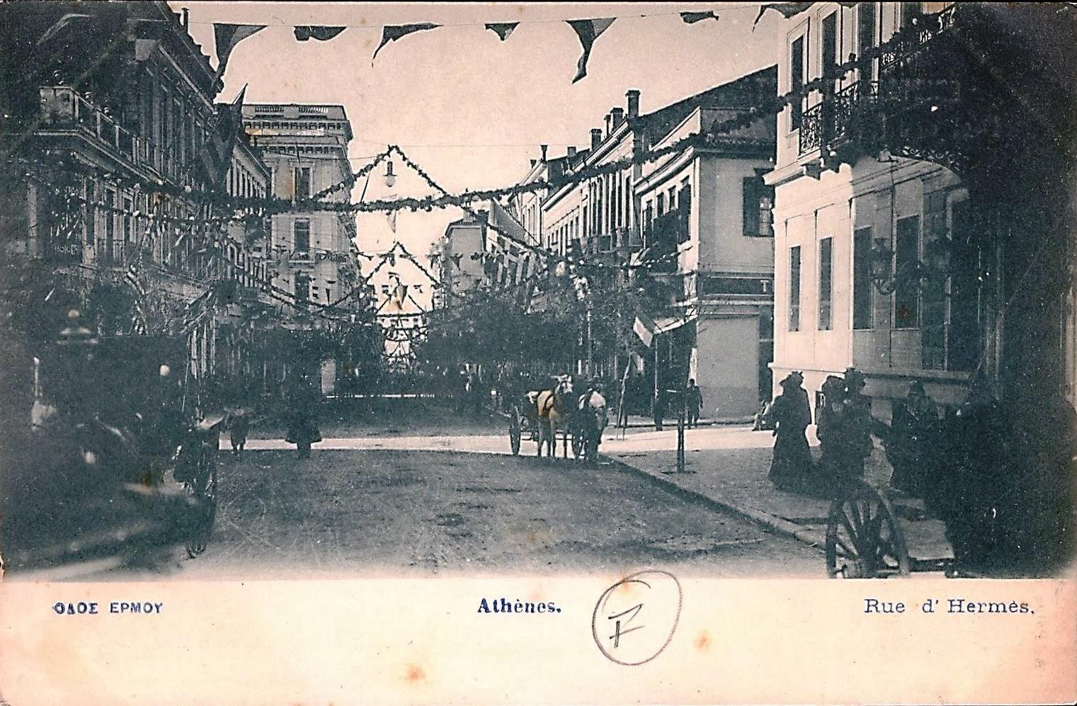 Το 1872 ο αμερικάνος περιηγητής Κάρολος Τάκερμαν, αφού πρώτα την προσδιορίζει γεωγραφικά «Από της πλατείας Συντάγματος άρχεται η οδός του Ερμού, ενός μιλίου μήκος, πλήρης ένθεν και ένθεν εμπορικών καταστημάτων η οδός αύτη καταλήγει εις την οδόν του Πειραιώς», εν συνεχεία επισημαίνει κάποια προβλημάτων της :«…το κόψιμο των ανδρικών ενδυμάτων και η επιμήκης μεταξωτή εσθής (ένδυμα), η ανεγείρουσα νέφη κονιορτού στην οδό Ερμού, δεν έχουν εκείνη τη κομψότητα του Βουλεβάρ ντεζ Ιταλιέν του Παρισιού». Τότε, ακόμα συνυπάρχουν αρμονικά στο δρόμο εμπορικά καταστήματα, μοδίστρες και κεντήστρες, μαζί με κατοικίες και ζαχαροπλαστεία.