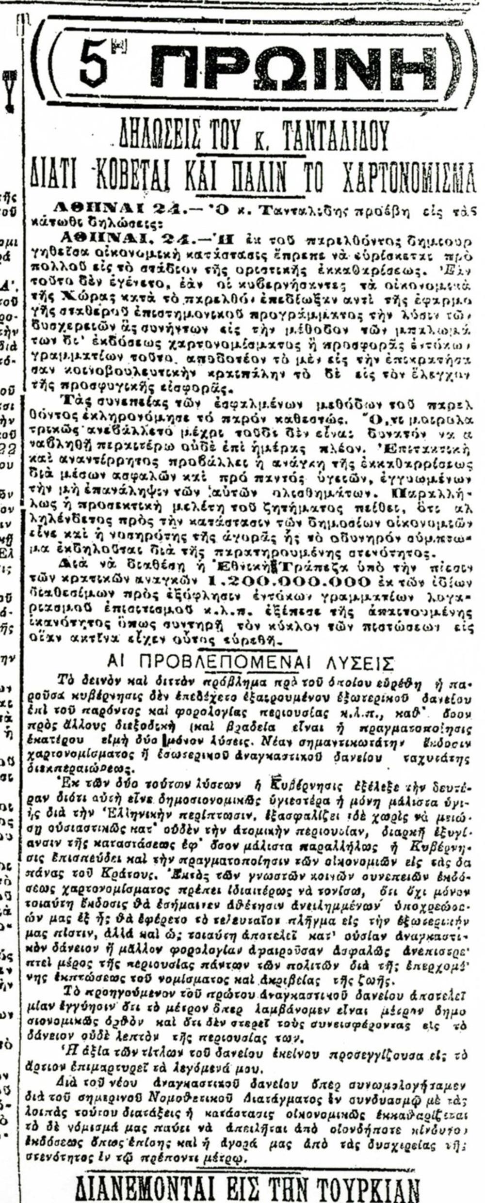 Οι εφημερίδες δημοσιεύουν οδηγίες για το σωστό κόψιμο του χαρτονομίσματος, ενώ ο Πάγκαλος κάνει τις κλασικές καθησυχαστικές δηλώσεις που διαχρονικά ακούμε από τα χείλη των αρμοδίων :«Ο ελληνικός λαός καλείται να συνεισφέρει ολόκληρος δια την ανόρθωσιν των δημοσίων οικονομικών της χώρας και πρέπει να είναι βέβαιος ότι η μικρά αυτή θυσία και αι εξ αυτής πρόσκαιροι δυσχέριαι θα είναι ασφαλώς αι τελευταίαι».