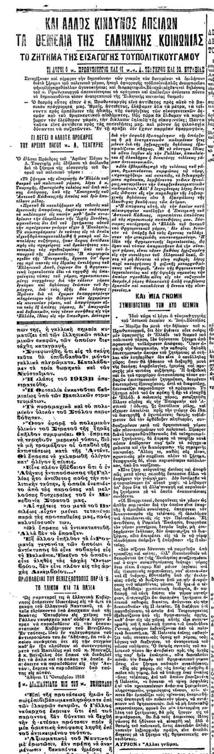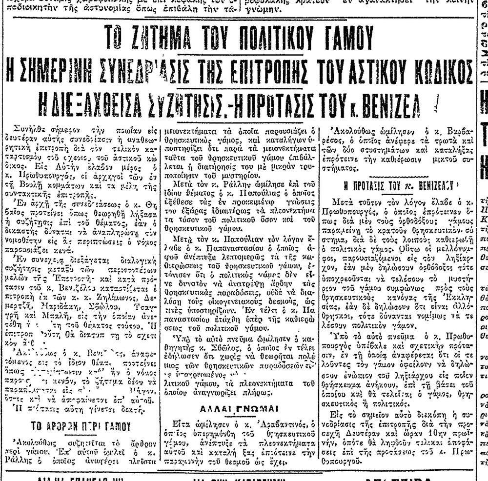 Ο πρωθυπουργός Ελευθέριος Βενιζέλος αφού θέτει το θέμα αν ο γάμος είναι μυστήριο ή έθιμο, αναφέρει: «Δι’ εμέ, δεν υπάρχει καμία αμφιβολία ότι πρέπει του λοιπού ο πολιτικός γάμος να είναι συστατικόν στοιχείον του κύρους του γάμου δι’ όλους τους Ελληνας». Αντίθετη άποψη έχει ο αρχηγός του Λαϊκού Κόμματος Παναγής Τσαλδάρης, που αναφέρει ότι στο ζήτημα αυτό δεν μπορούμε να λάβουμε απλώς υπόψη τους νόμους και το Σύνταγμα, αφού «…η συνείδηση οιουδήποτε Ελληνος Ορθοδόξου θα διαμαρτυρηθή επί τω ακούσματι απλώς, ότι πρόκειται να επιβληθή ο τύπος του πολιτικού γάμου».