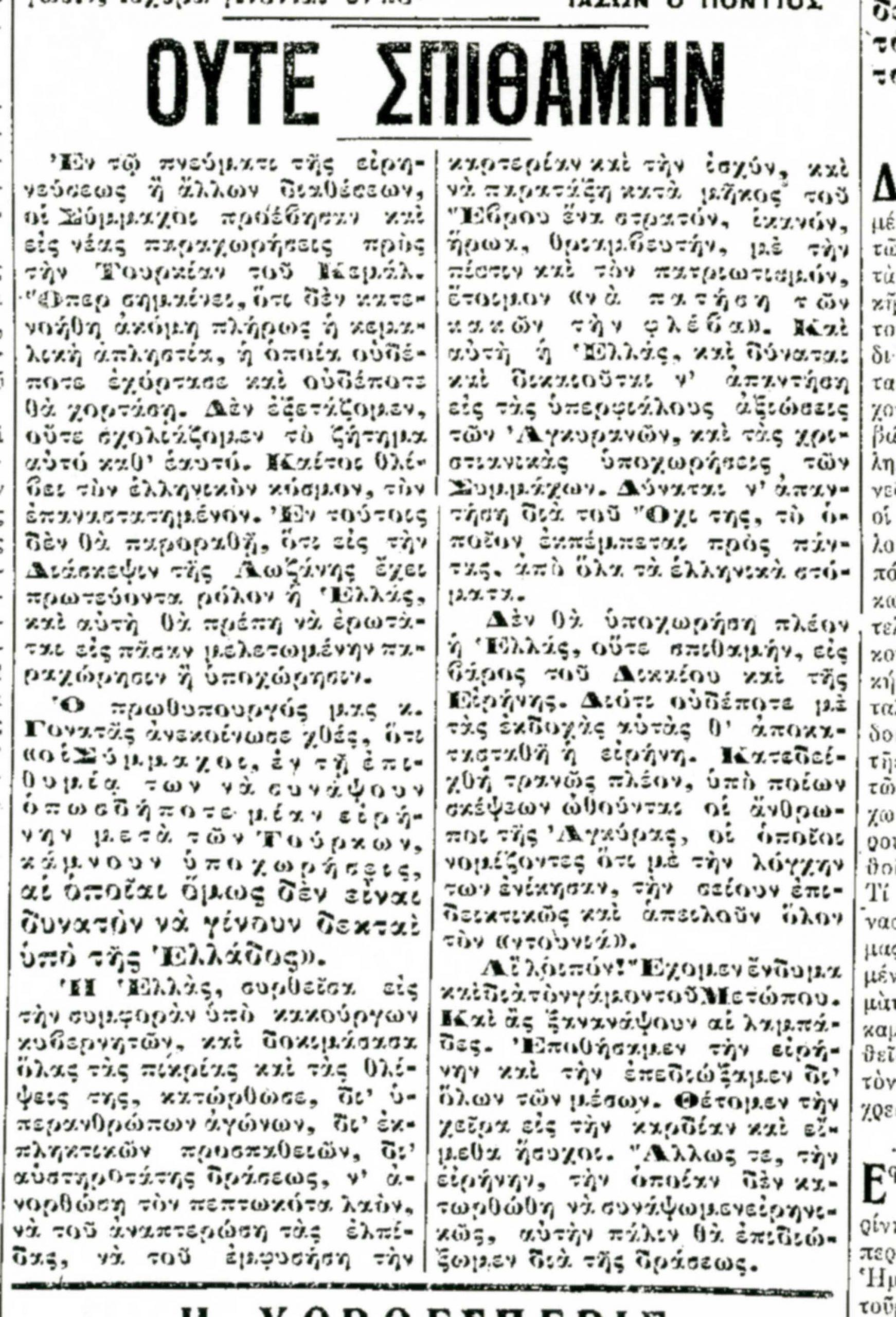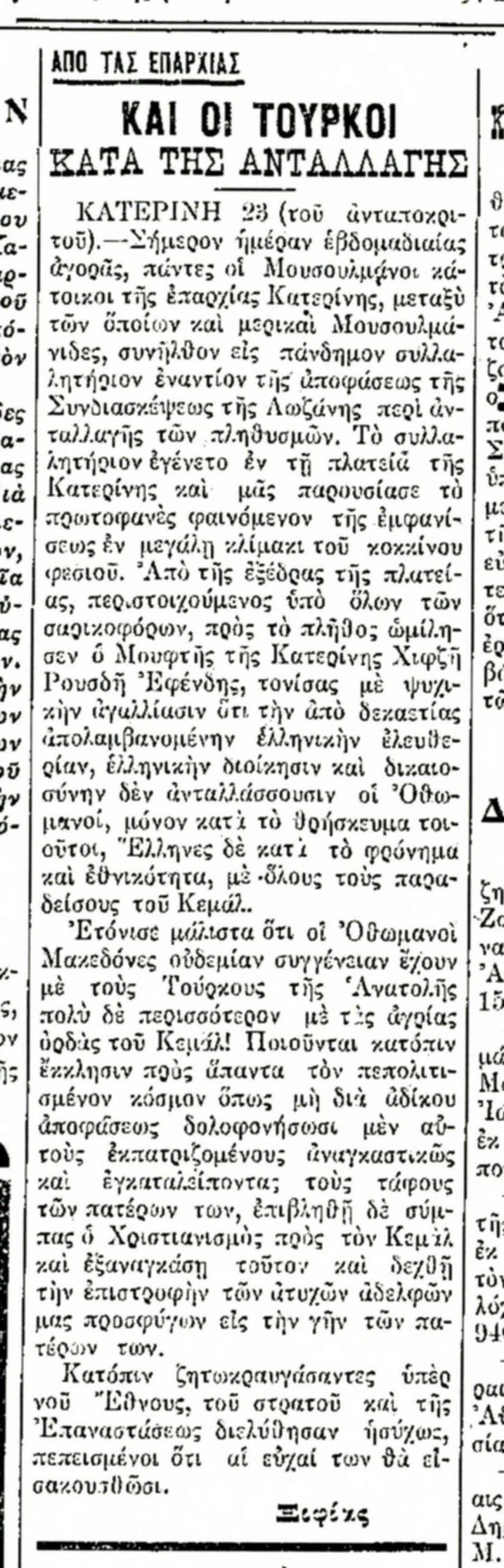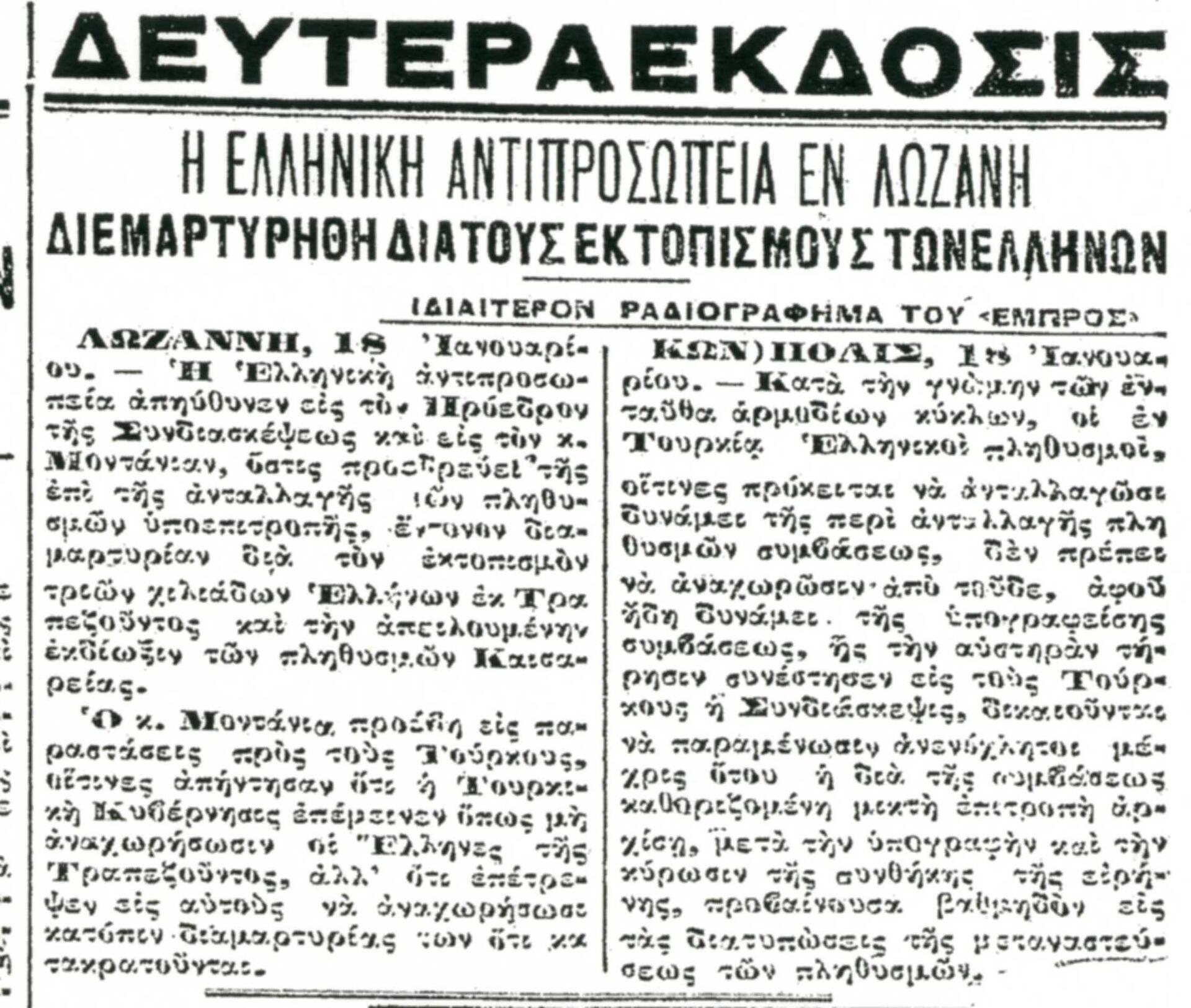 Τότε, μετά από πολυήμερη διεθνή Διάσκεψη Ειρήνης στη Λοζάνη, μπαίνουν οι βάσεις μιας συμφωνίας που αντικαθιστά τη Συνθήκη των Σεβρών την οποία δεν αναγνωρίζει ο Κεμάλ. Οι διαπραγματεύσεις για την Ελλάδα είναι εξαιρετικά δύσκολες, αφού ουσιαστικά συζητά τις τουρκικές απαιτήσεις που επιβάλλει η ήττα μας στο μικρασιατικό μέτωπο.